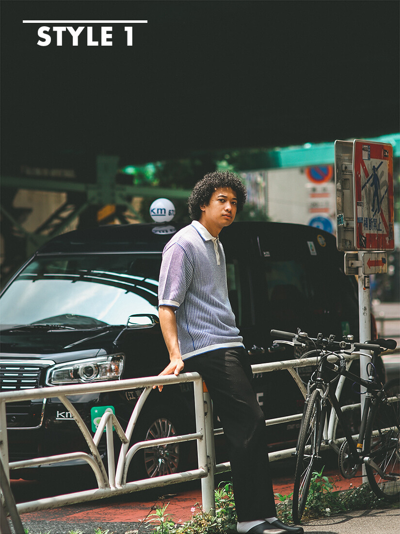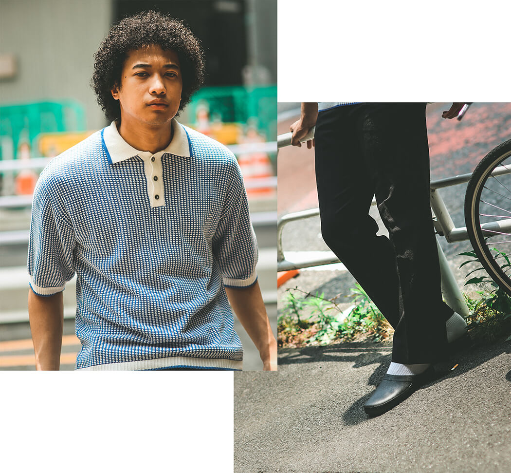 - 古着テイストのニットポロに、スラックスを合わせることで綺麗目に仕上げました。