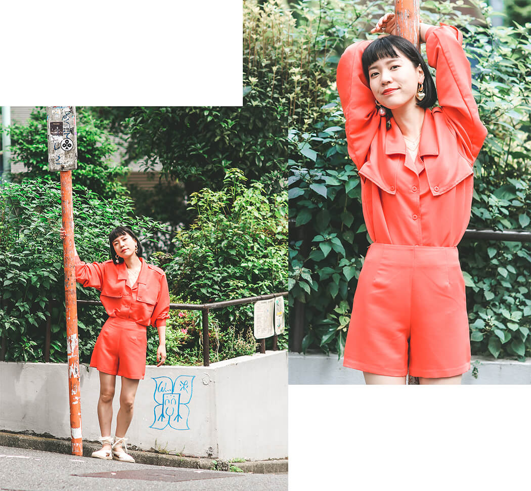 - 鮮やかなオレンジのセットアップはシンプルに着こなすのがおすすめです。