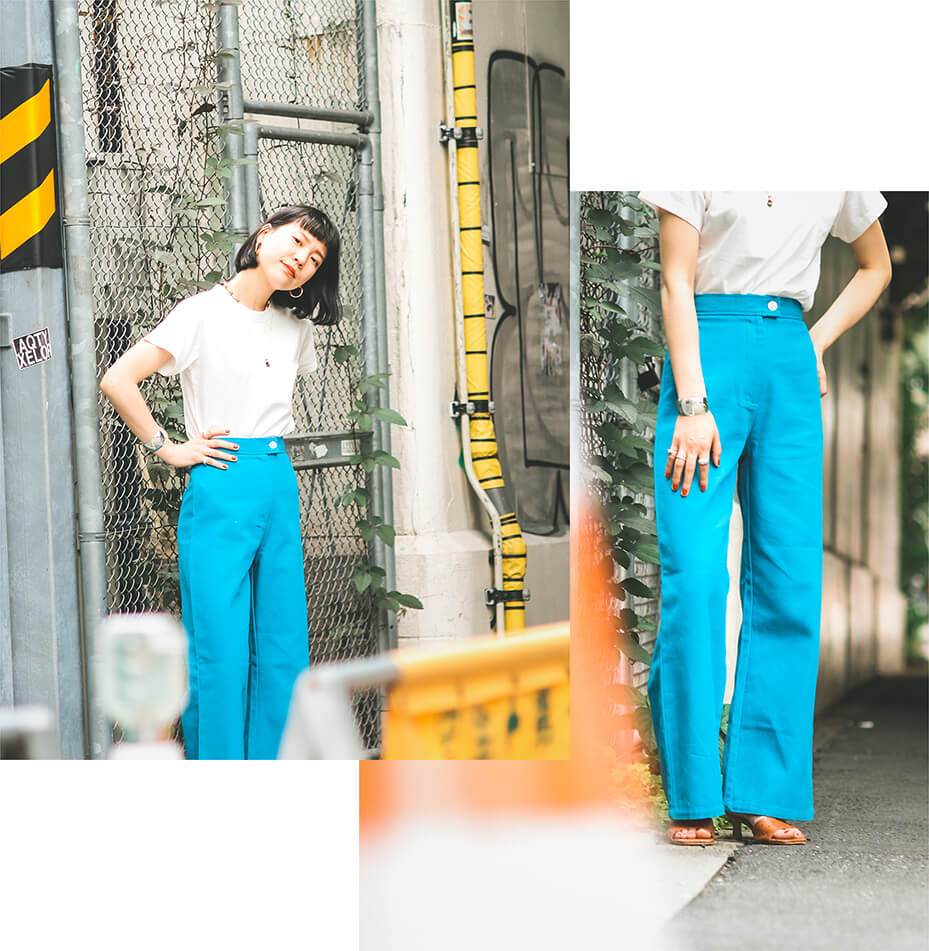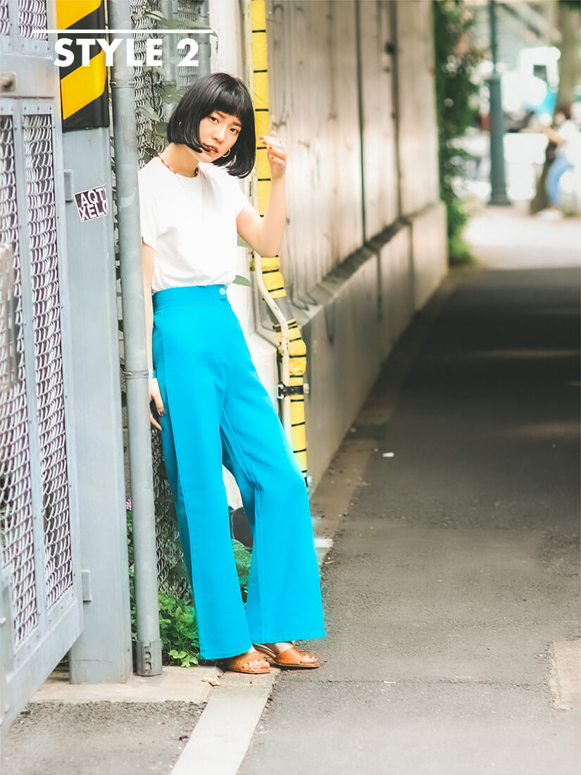 - コバルトブルーのハイウエストパンツは夏の主役級アイテム。