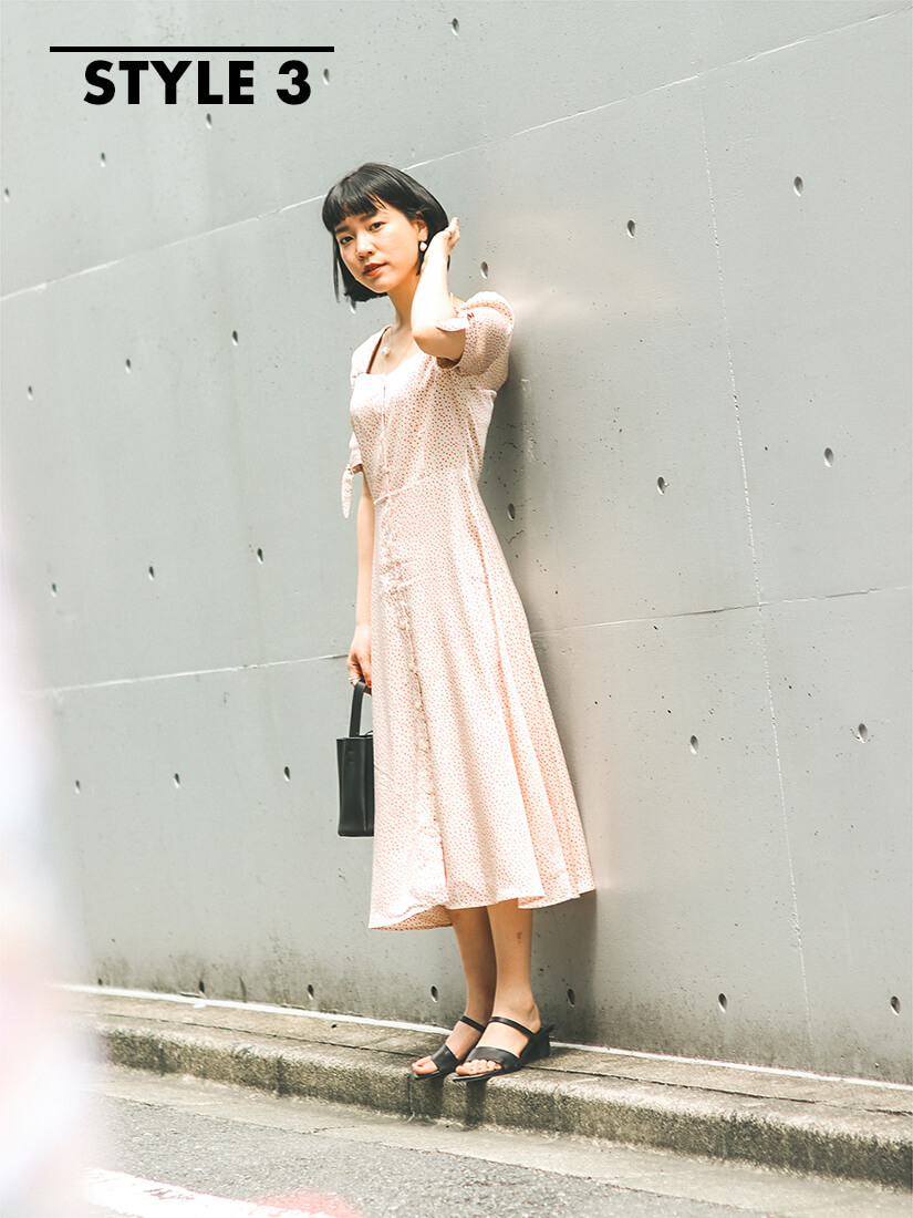 - スクエアネックがどこかレトロな印象のサテンドットワンピースはさらっと一枚で着たい。
