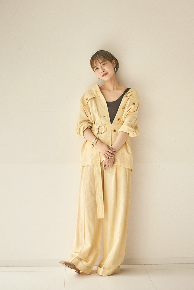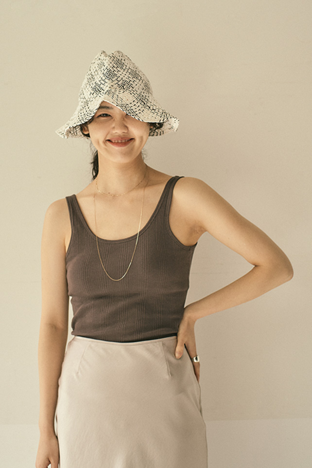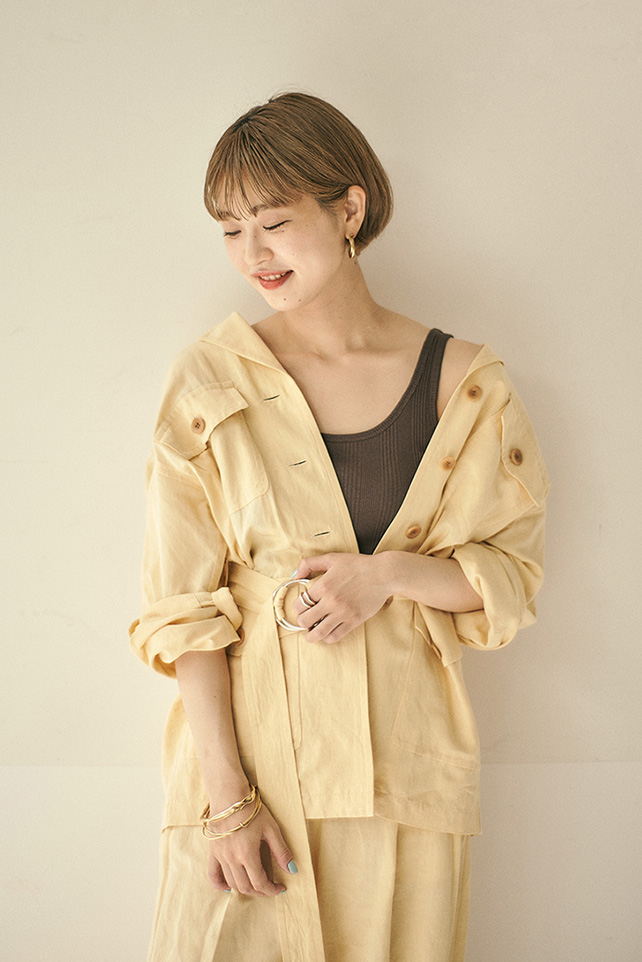 淡い黄色のセットアップに、ブラウンタンクをイン。ジャケットの襟を抜き気味にして、こなれた感じに。」- EMILY WEEKOGCランダムリブタンクトップ¥9,020(税込)
