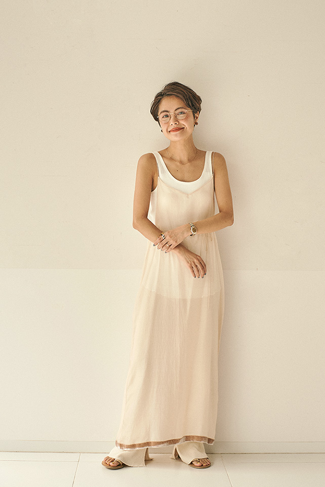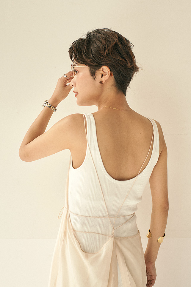 華奢な紐が印象的なEMILY WEEKのキャミワンピと合わせたワントーンスタイルです。」- EMILY WEEKOGCランダムリブタンクトップ¥9,020(税込)