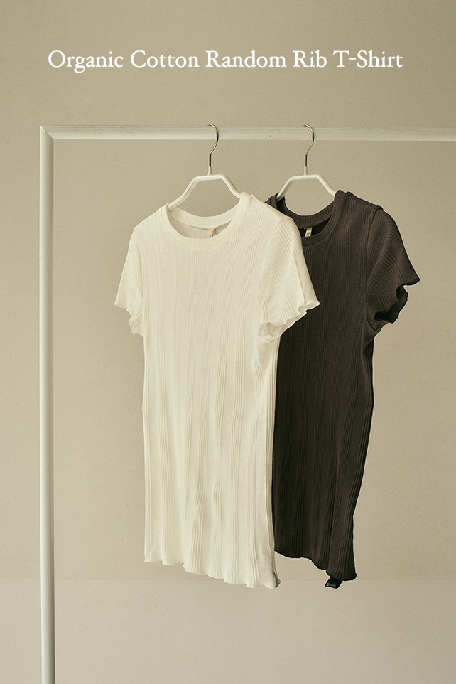 オーガニックコットンのランダムリブ、フレンチスリーブの袖など、こだわりがぎゅっと詰まったTシャツ。脇に縫い目のないシームレスな仕立てで着心地にも配慮。