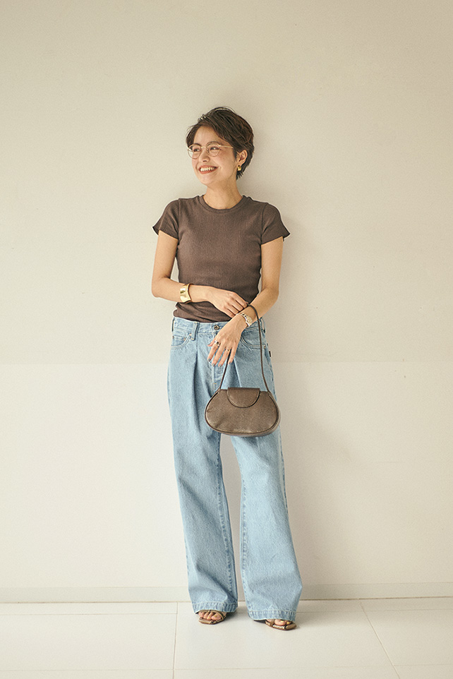 薄いブルーと茶色の色あわせが好きなのと、ワイドデニムとのバランスがポイントです。」