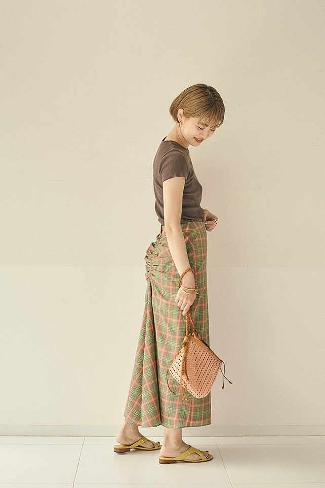 シックなブラウンに、ヴィヴィッドカラーのスカートをアクセントに持ってきました。バックのお尻のギャザーがポイント。」- EMILY WEEKOrganic Cotton ランダムリブ Tシャツ¥9,020(税込)
