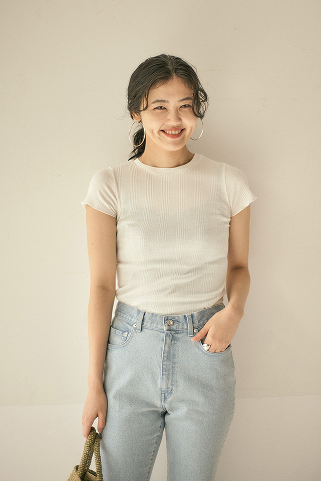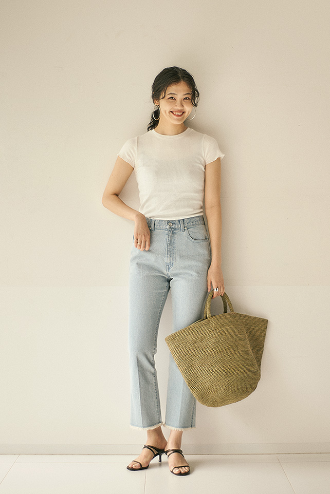 白Tとデニムを合わせたシンプルなコーディネートには、ポイントになる大きなかごバッグを合わせて。」- EMILY WEEKOrganic Cotton ランダムリブ Tシャツ¥9,020(税込)