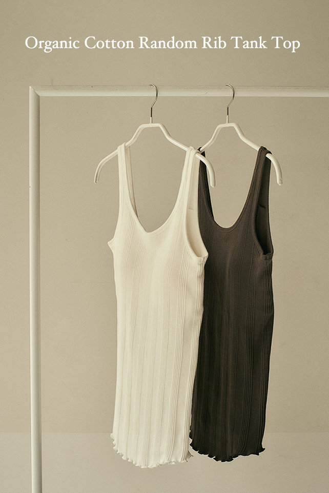 Tシャツと同素材のランダムリブ生地で仕立てたタンクトップ。嬉しいブラカップ付き。バックにラウンドカットを深めにいれることで、背中が大胆に開いたデザインの洋服とも好相性。