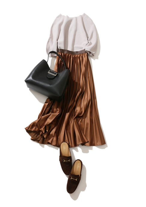 大事な会食やいつもよりかしこまったレストランでのデートに着ていきたい、旬のブラウンを取り入れた女っぽコーデ。大人フェミニンなパフスリーブのトップスに合わせたのは、上品なツヤが動くたびに表情を変えるプリーツスカート。スカートとトーンを合わせたビットモカシンで、甘くなりすぎないようにバランスを調整して。