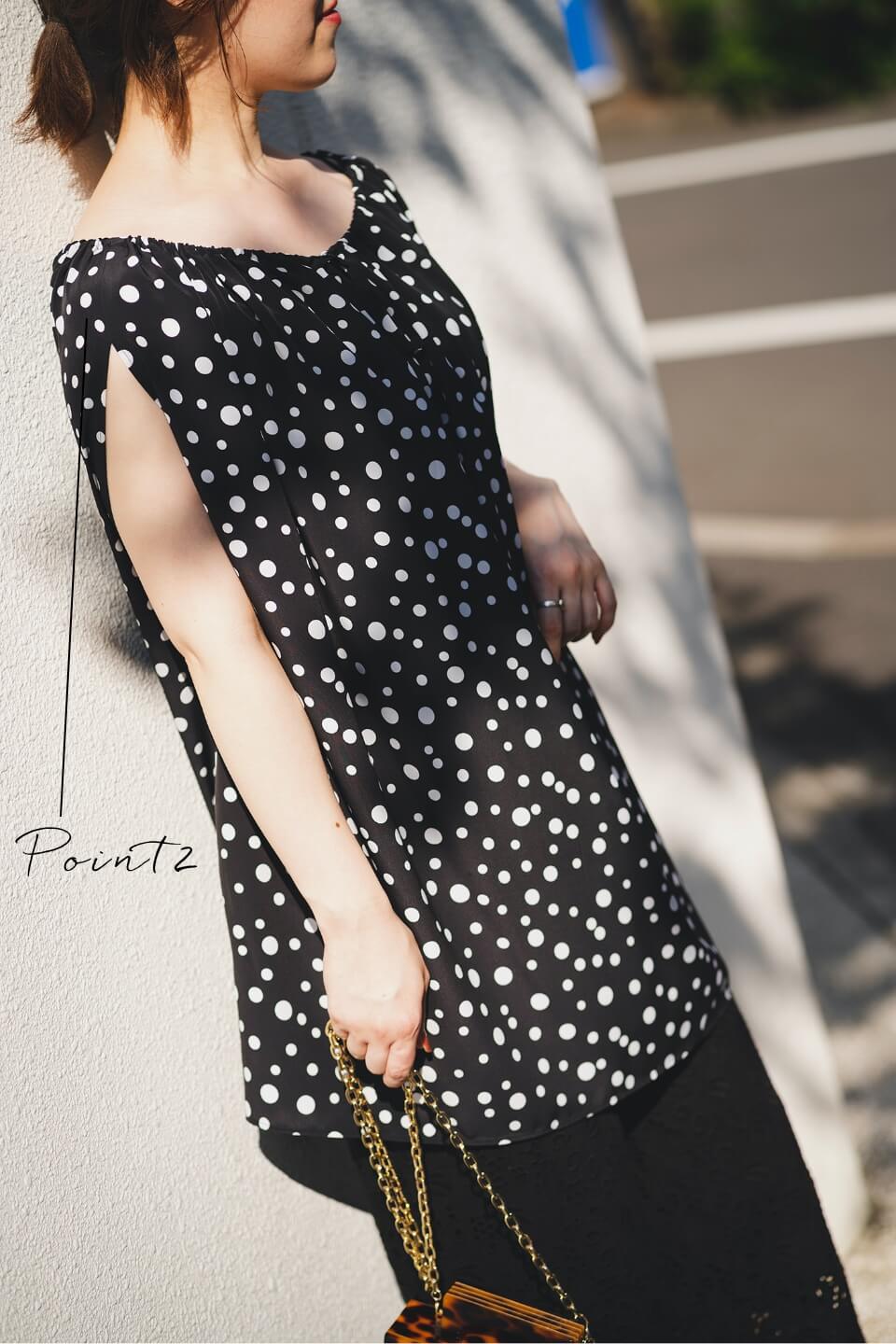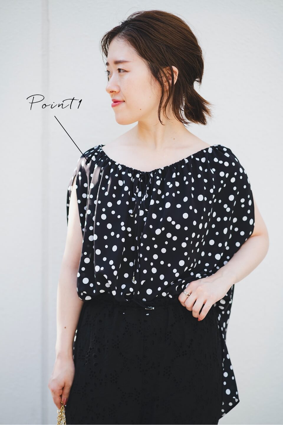POINT2体が泳ぐゆったりめのシルエット。さらに首の開き具合はリボンで調節可能。袖が肩にかかる程度に調節すれば、二の腕カバーにも。