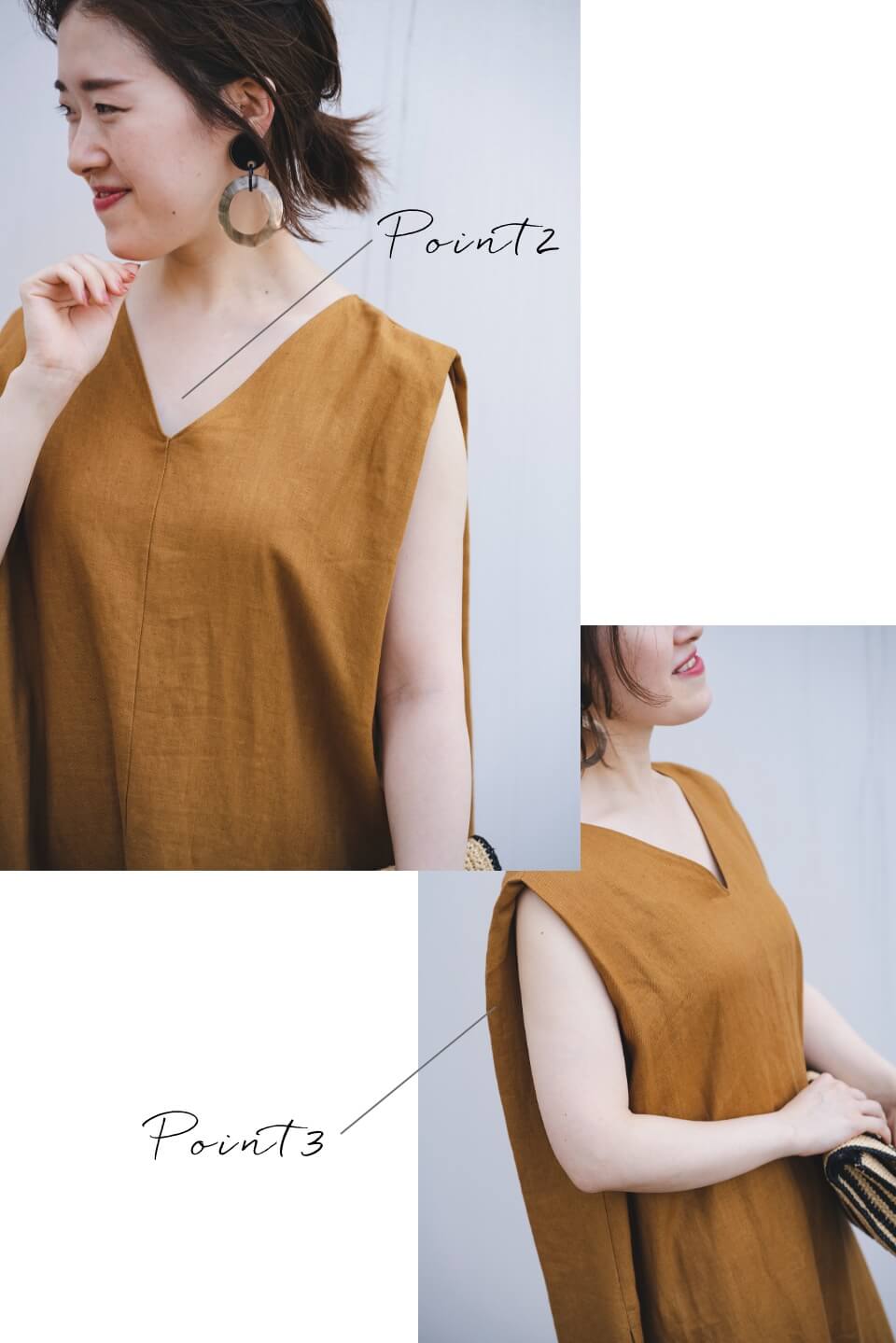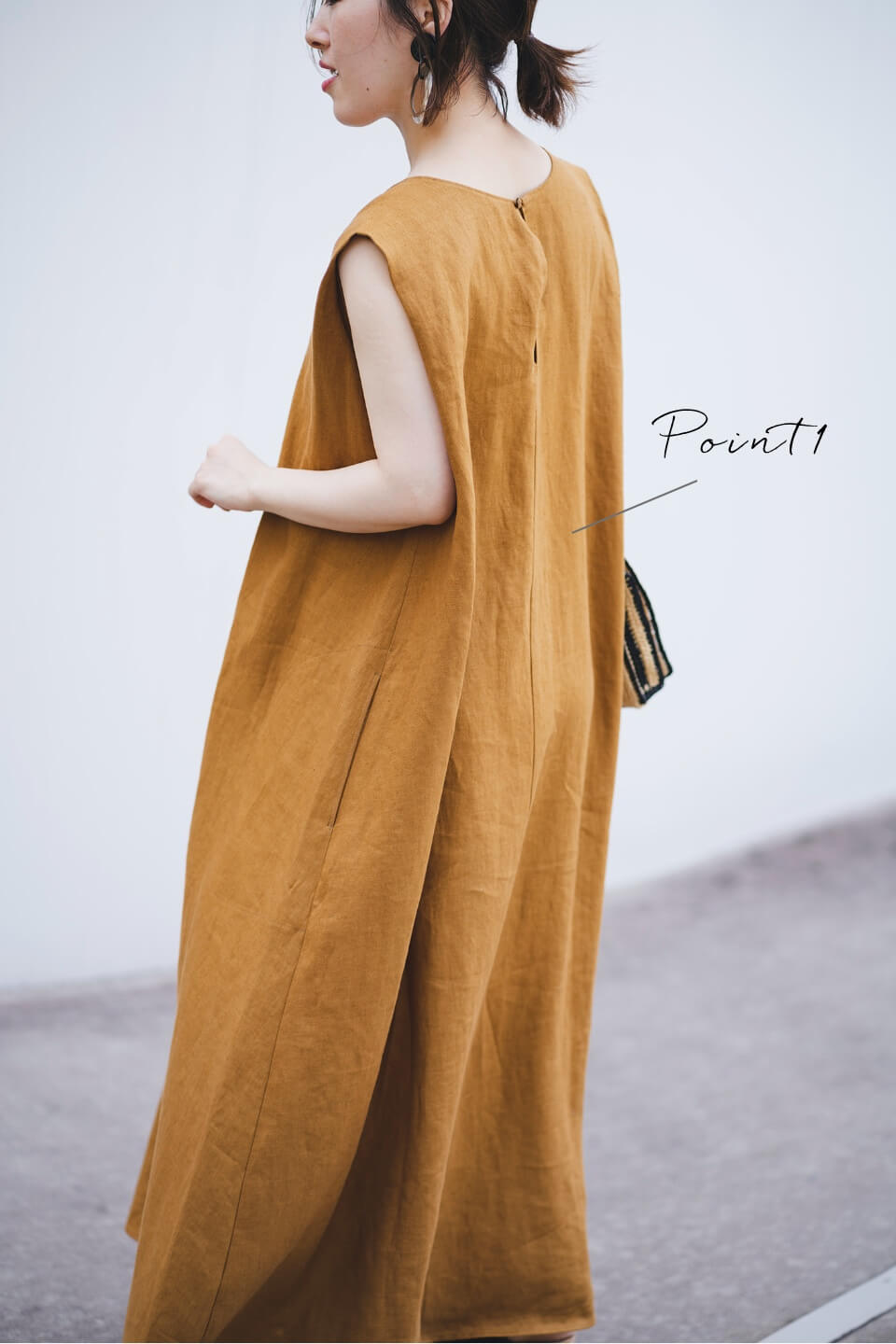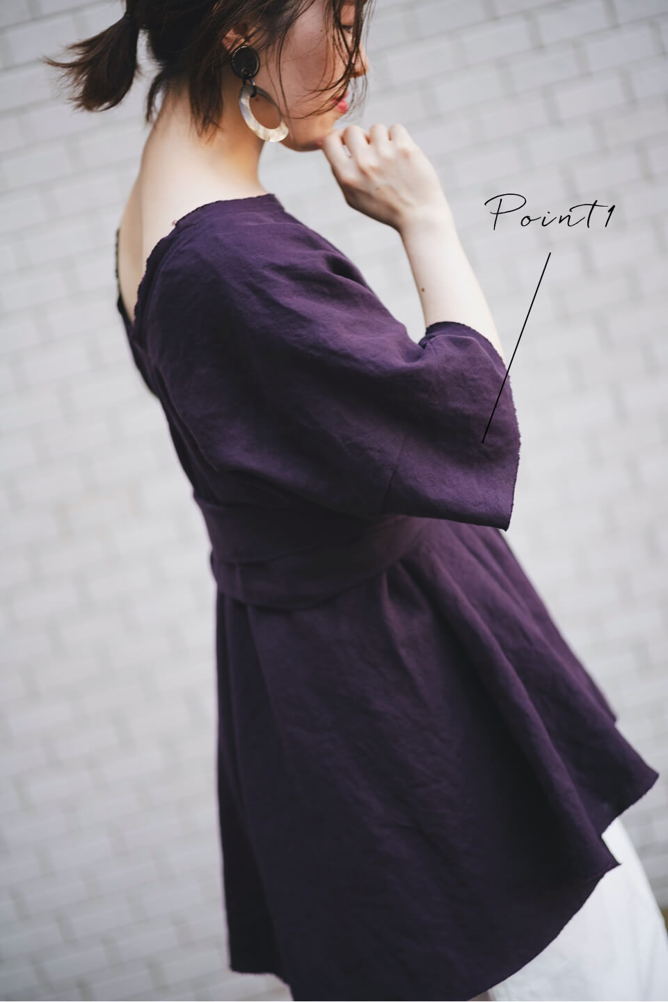 POINT1二の腕をしっかりカバーしてくれる、ハーフ丈の旬なビッグスリーブ。上品に肌見せしながら、リネン素材が涼しさをキープ。