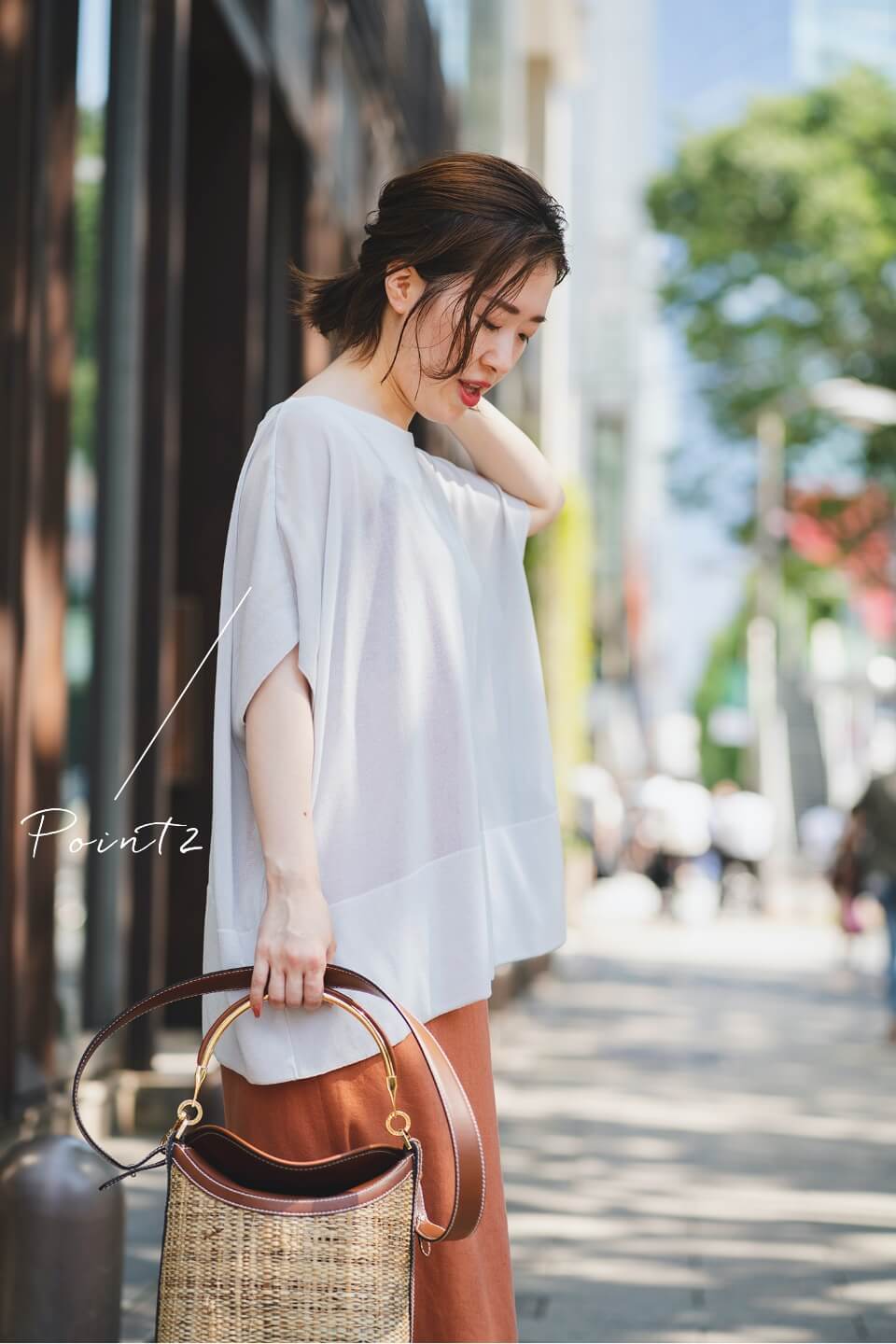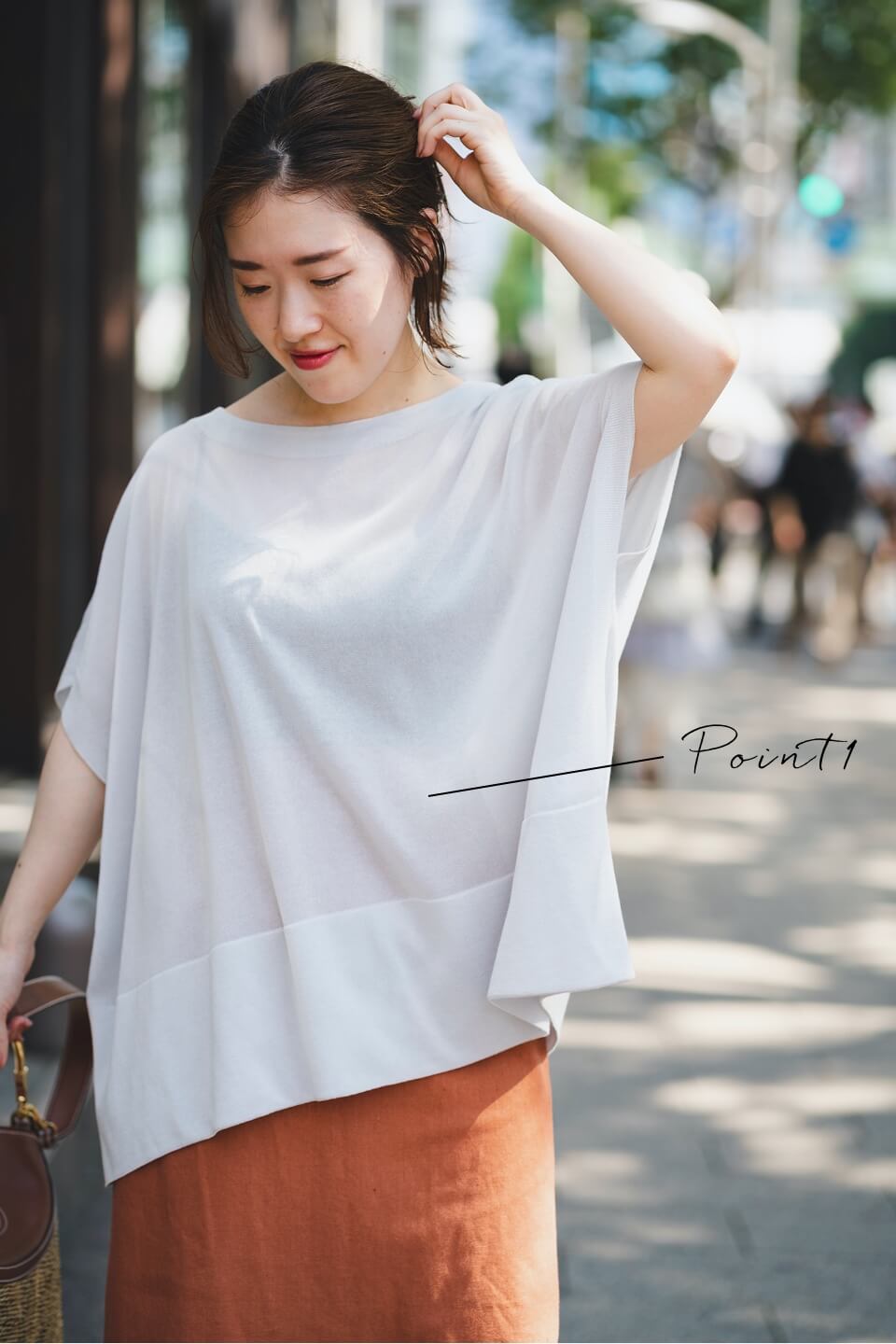 POINT2ドロップショルダーのラインとハーフ丈の袖が優しく二の腕を覆い、上品さもキープ。ドライタッチで涼しげな印象も◎。