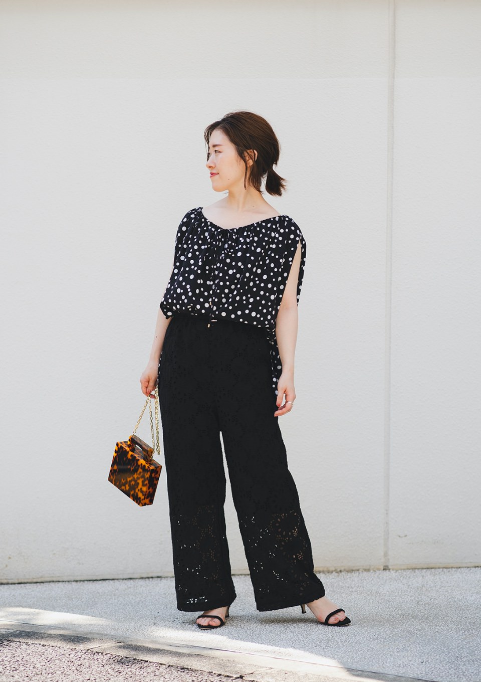 ハリ感のあるエンブロイダリーパンツを合わせて、黒ベースだけど表情にコントラストのある異素材MIXコーデに仕上げて。