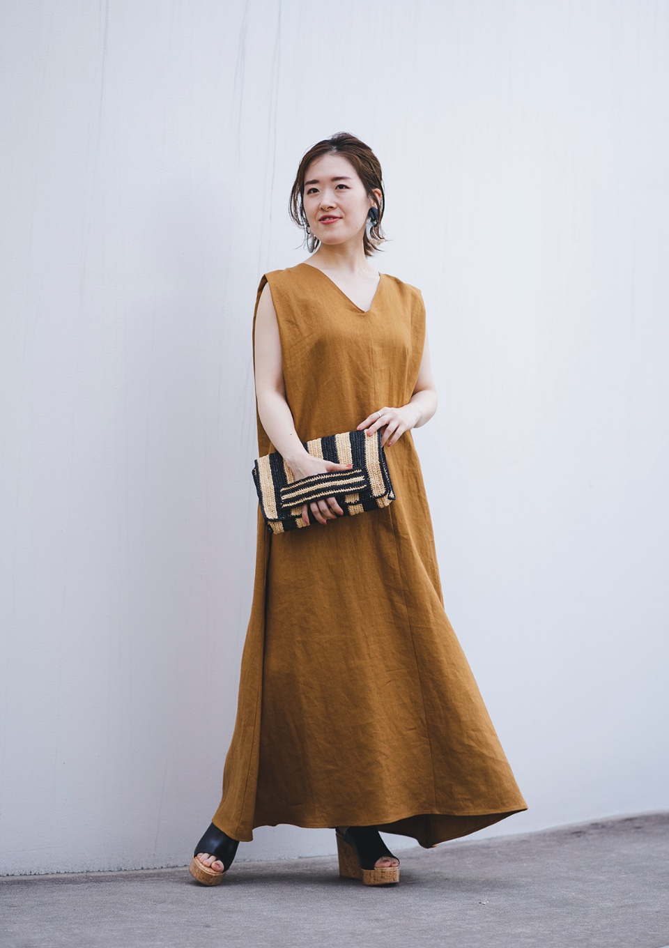 落ち着いたムードのブラウンリネンワンピースは、シャープなVネックのフレアラインで切れ味良く。足元はウエッジソールで脚長効果にも期待。