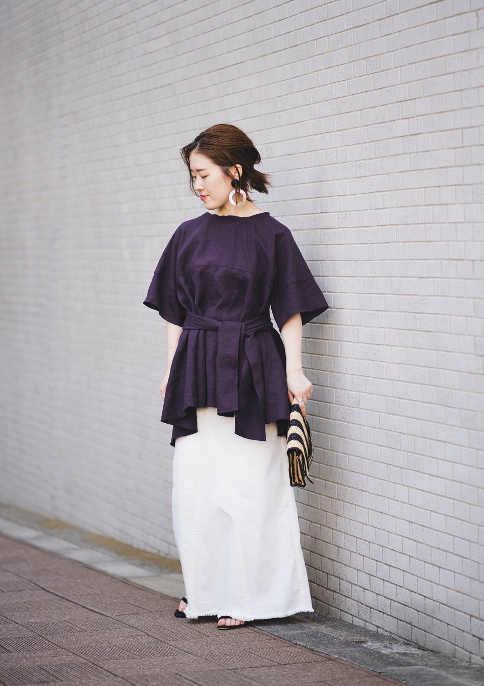 気になる部分を隠しながらウエストをギャザリングすることで、女性らしいラインをメイク。ボトムスは白スカートで爽やかに。