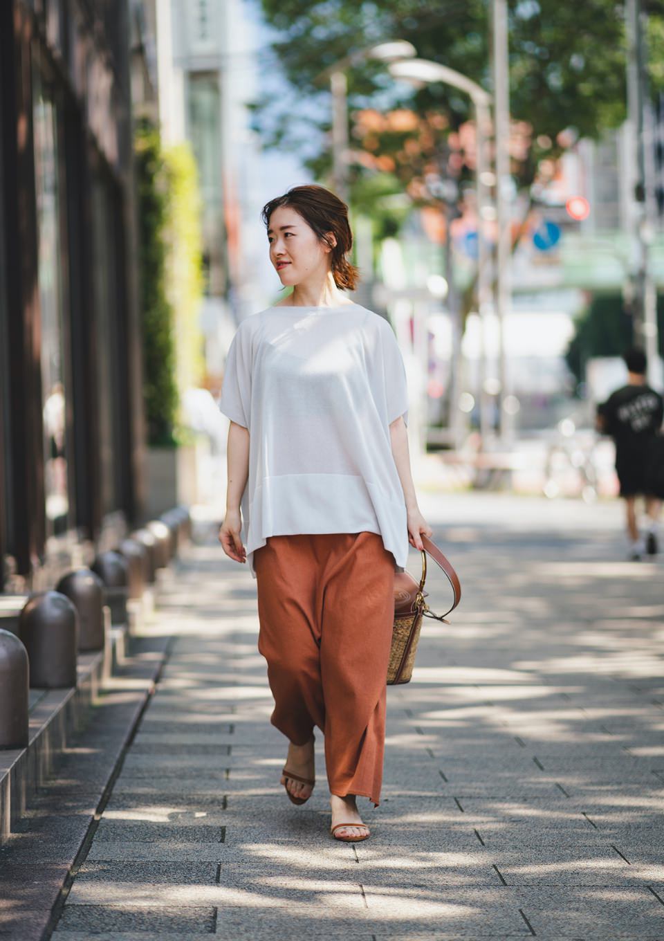 柔らかいニットトップスには、テラコッタオレンジのボトムスを合わせてスタイルにメリハリを加えて。