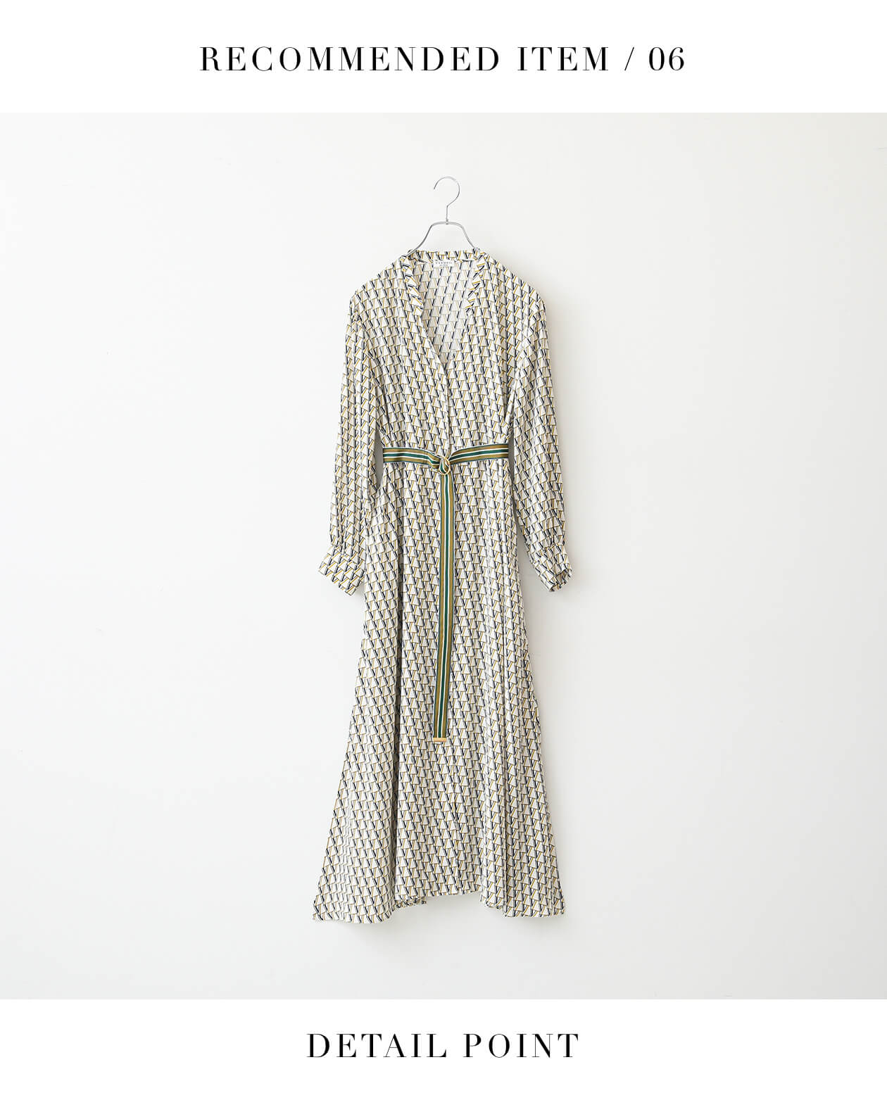 明るい色味が多く、元気な印象になりがちなスプリングタイプのワンピースも、ヴィンテージライクなモノグラム柄ならシックで上品に。差し色に効いたグリーンのリボンベルトが、さらに大人の雰囲気を格上げしてくれます。