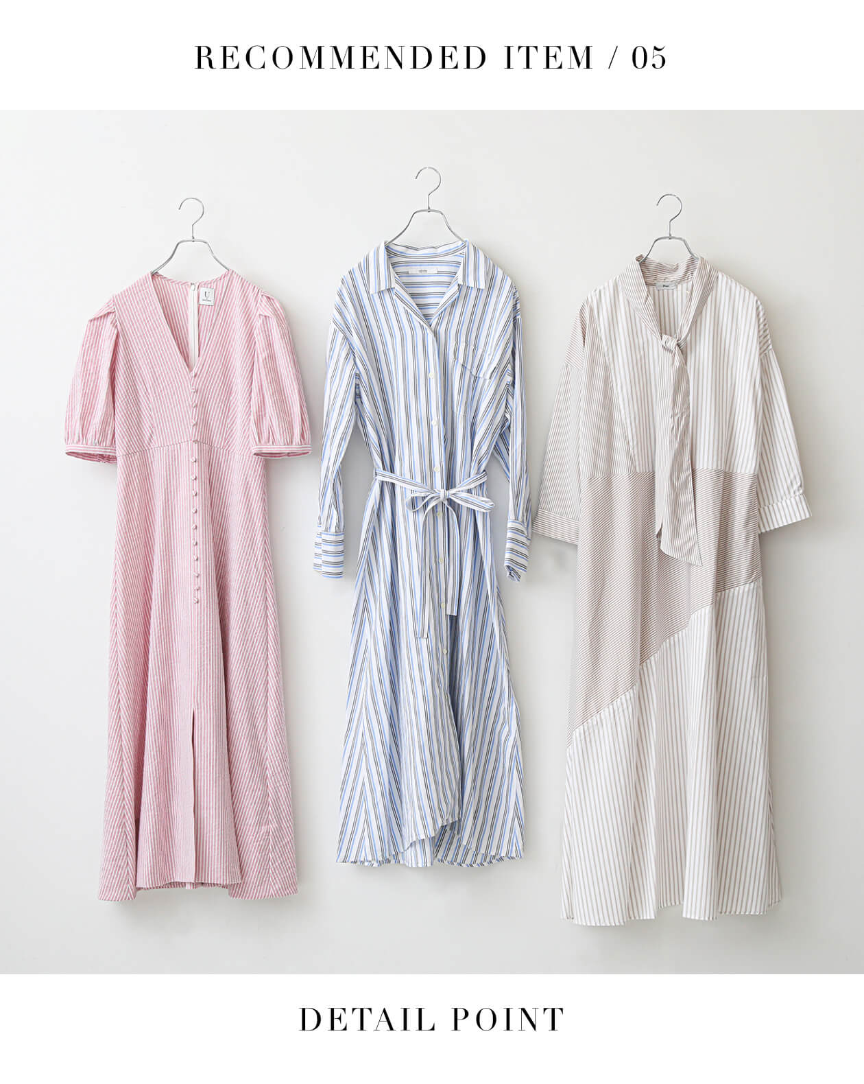 サマータイプの爽やかさを引き立ててくれるストライプのシャツワンピースは、色選びで印象チェンジ。ピンク×ホワイトでレディに、ブルー×ホワイトならキリッと大人っぽく、ベージュ×ホワイトのニュアンスカラーならやわらかく上品な着こなしに。オープンカラーやボウタイなど、印象ががらりと変わるディテールにも注目して。 - U by SPICK&SPANストライプドレス◆¥17,600(税込)