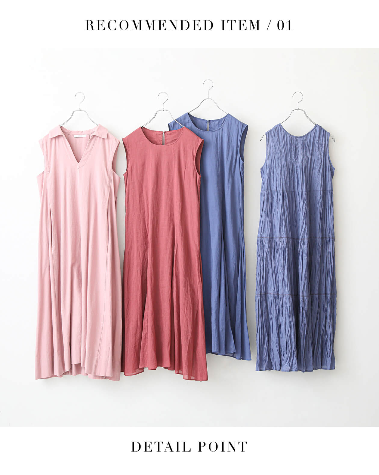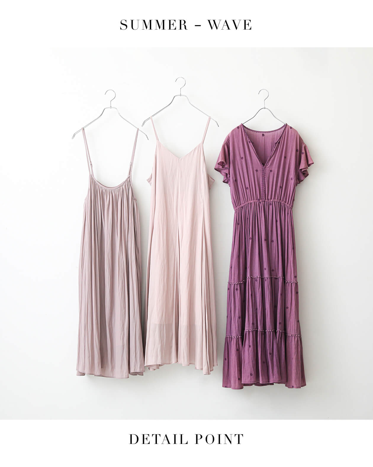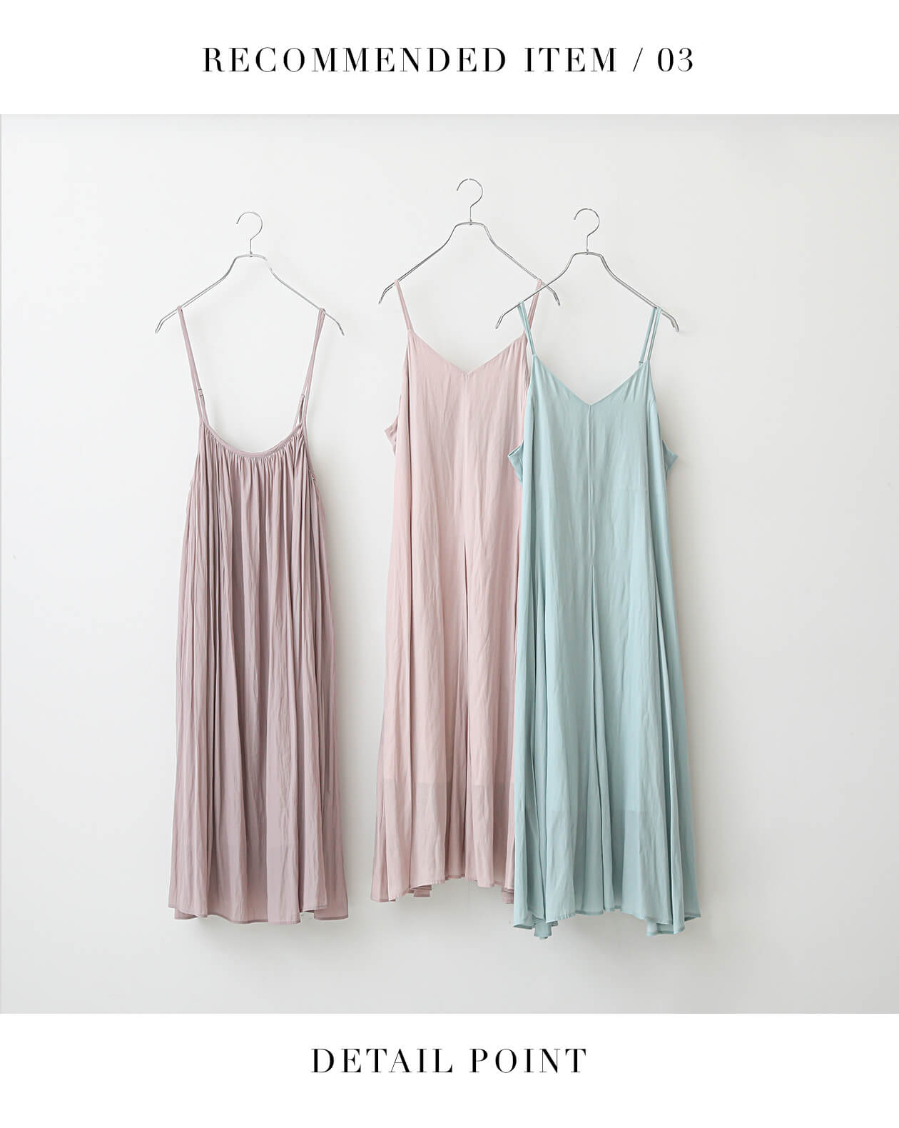 暑い夏も爽やかに乗り切れそうなシャーベットカラーのラインナップ。細ストラップや胸元のギャザーがフェミニンを際立たせたデザイン。サマータイプに合う、ややくすんだマシュマロホワイトのTシャツやタンクトップをレイヤードした、カジュアルな着こなしがおすすめです。 - JOURNAL STANDARDカッセンデシンギャザーキャミワンピース◆¥13,200(税込)