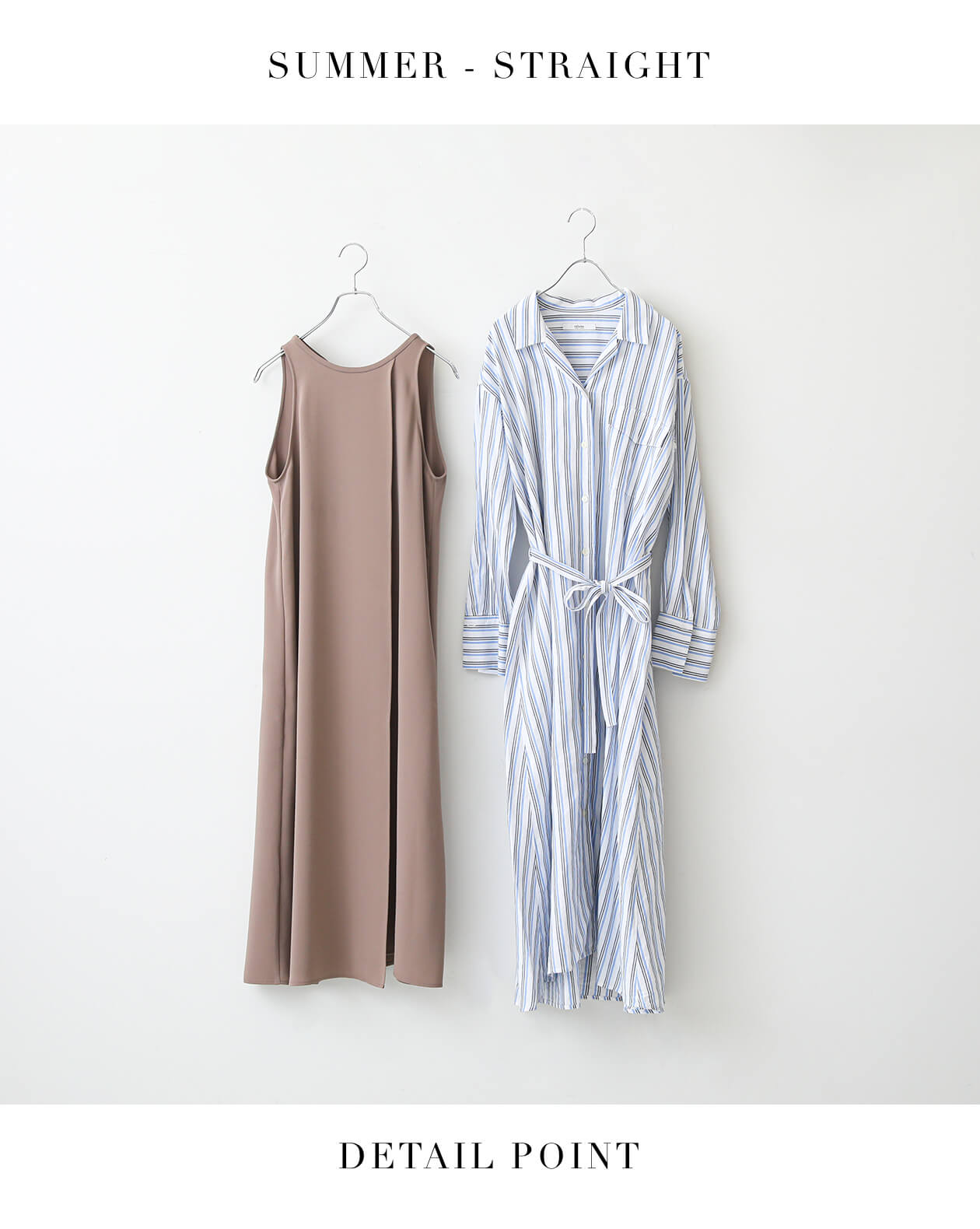 ストレートタイプの服選びは高見えする上品な素材感とデザインがポイント。ストンとしたIラインのアメスリワンピースや、リネン素材のストライプが爽やかなシャツワンピースなど、長く着られるシンプルな1着を選んで。Vネックやウエストマークで、体に沿った縦ラインを意識するとさらにスタイルアップ! - NOBLEアメスリキャミワンピース◆¥23,100(税込)
