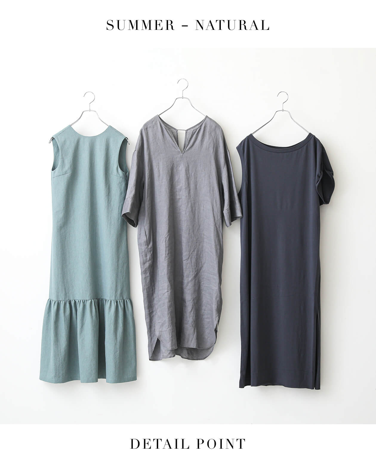 メンズライクなオーバーサイズをさらっと着こなせるナチュラルタイプは、マキシ丈のゆるっとしたワンピースがおすすめ。アシメスリーブのセットワンピなら簡単におしゃれが完成。レディなデザインはやり過ぎるとちぐはぐな印象になりますが、ミニマルなIラインから裾にフレアシルエットを切り替えたデザインなら、やり過ぎずOK! - U by SPICK&SPANBack V ギャザードレス◆¥15,400(税込)