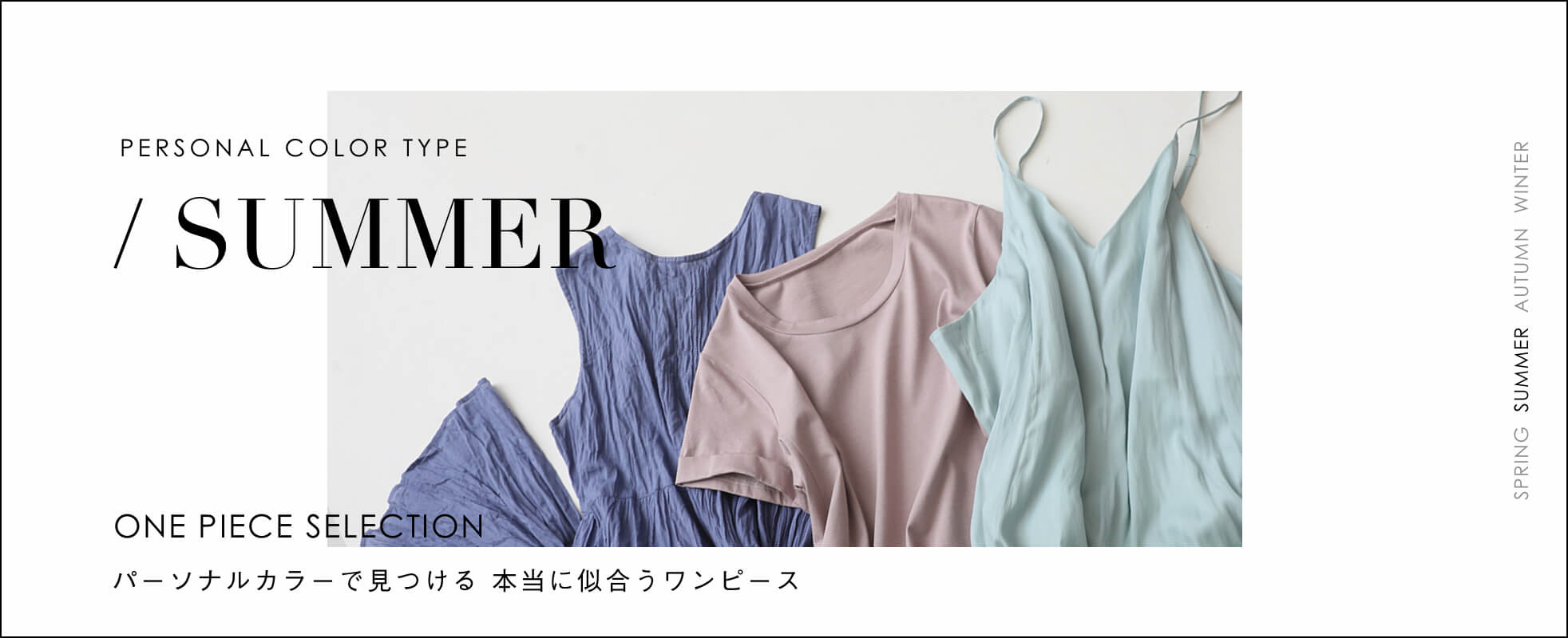 全身コーディネートの大部分を占めるワンピースは、自分に似合う色選びが何よりも重要!ブルーベースの中でも明るい色がお似合いなのがサマータイプ。ラベンダーブルーやペパーミントグリーンなど、ダスティでやわらかい色味がおすすめ。
