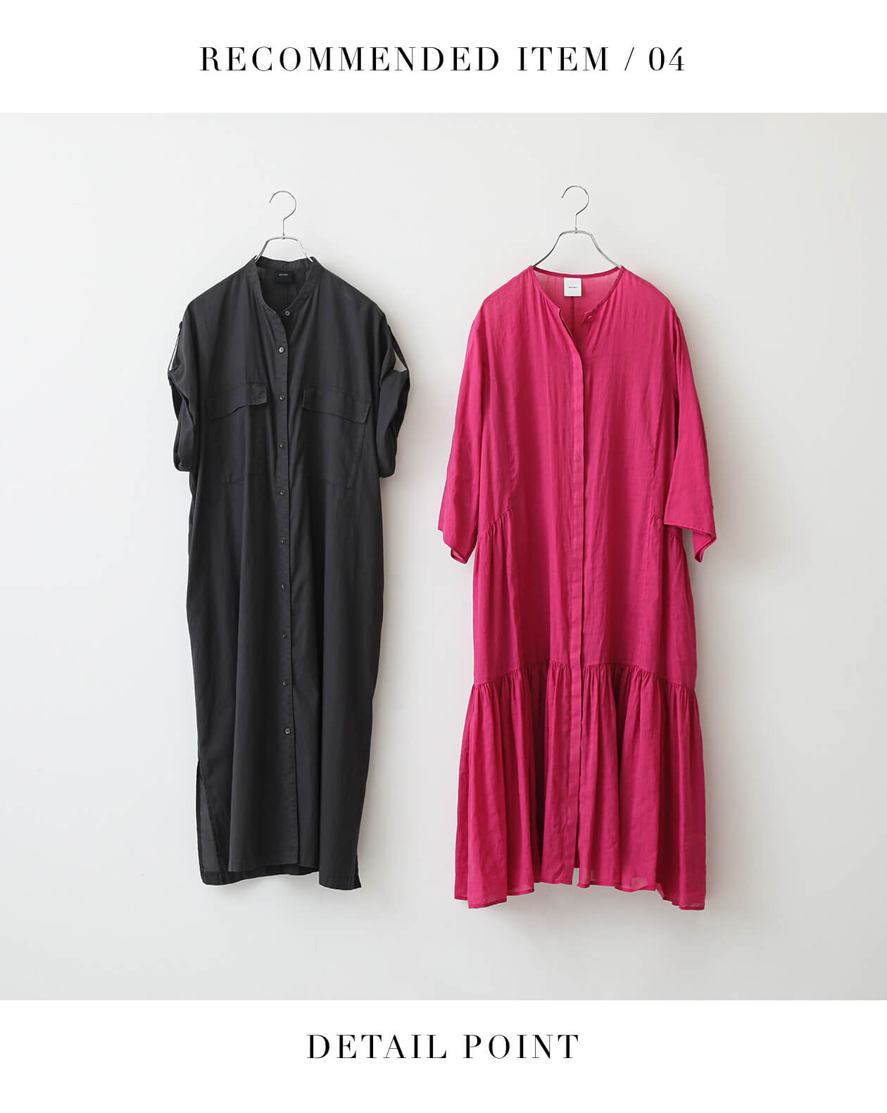使いやすいブラックと、差し色にオススメのフューシャピンクのワンピース。単品では抵抗感のある方は、前を開けて羽織りのように着こなしても◎。膝上の切り返しがリズムのあるふんわりティアードシルエット。鮮やかなピンクですが、ウィンタータイプが着ると意外に馴染むので一度チャレンジしてみて。 - Spick and Spanエアリーフレンチロールアップシャツワンピ◆¥19,800(税込)