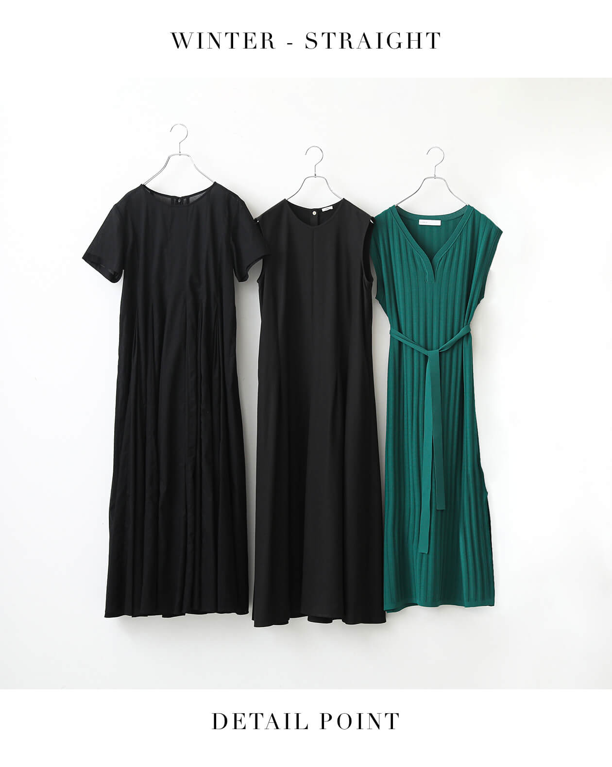 半袖やノースリーブなどのベーシックな袖丈で、シルエットも体にフィットするようなIラインがストレートさんのスタイルアップポイント。あくまでシンプルに、ウエストマークやVネックでボディラインを引き立てることがポイントです。端正な佇まいながら、贅沢にタックをあしらった上質なブラックワンピースにも注目。 - JOURNAL STANDARDインドボイルタックワンピース◆¥14,300(税込)