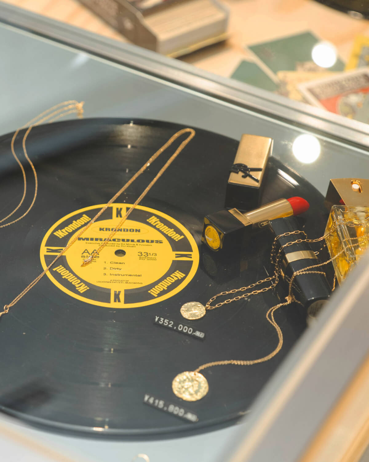 The store is filled with a casual playfulness, including records, art, and a jewelry case filled with lipsticks and perfumes, giving the impression of peeking into a closet.