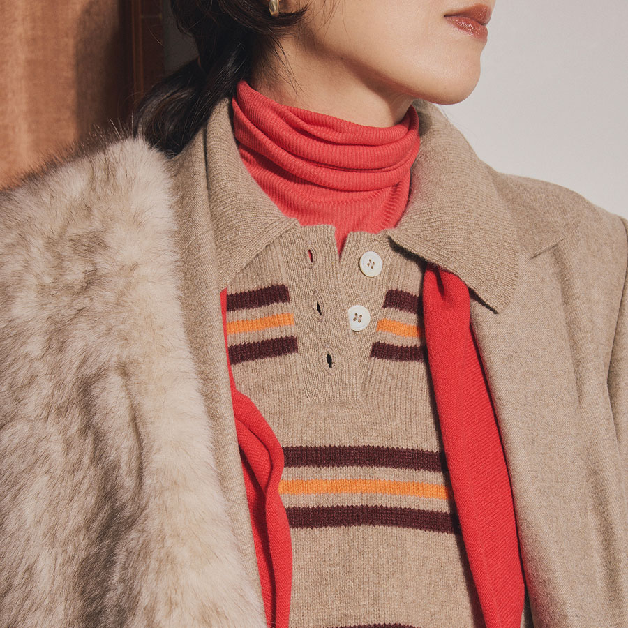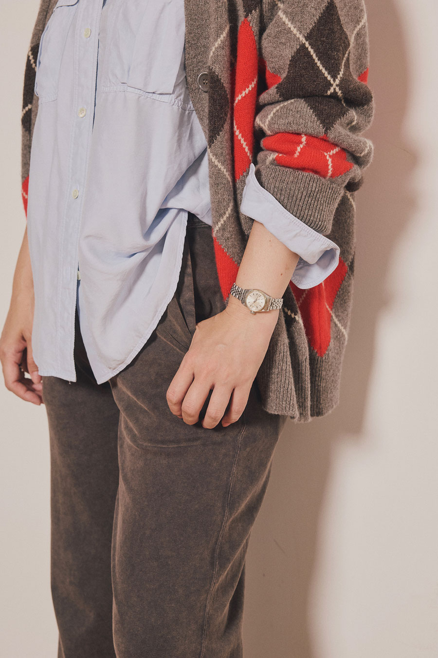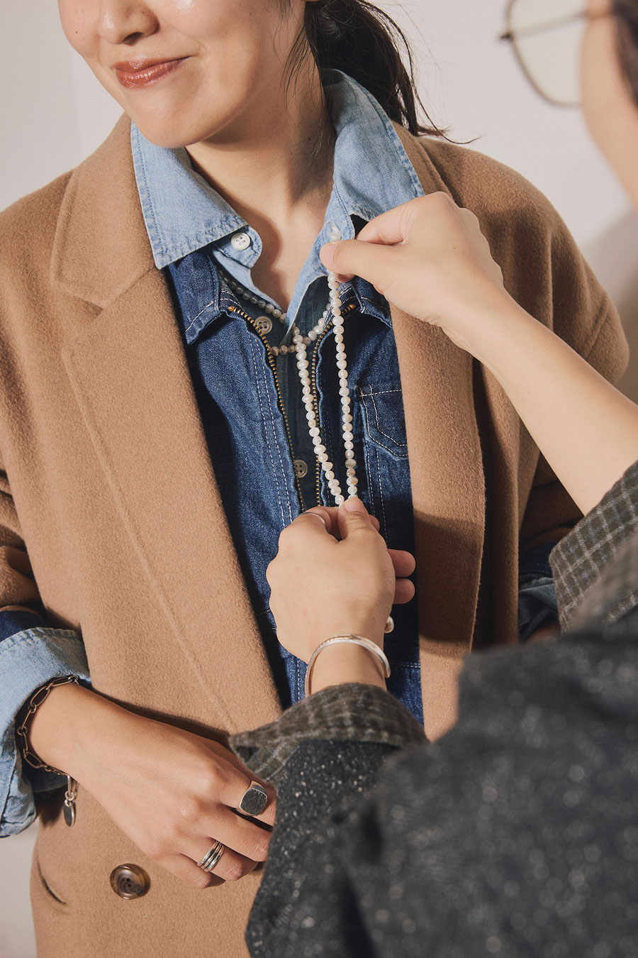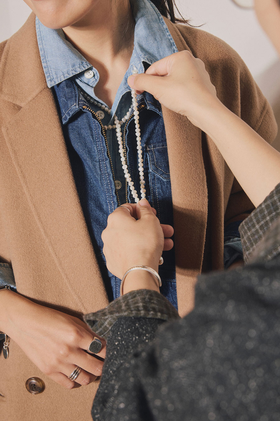 ヘンリーネックは首元を開けて抜け感を出しつつも、小物は重ためのものを合わせて程よくバランスを取るのが今の気分。