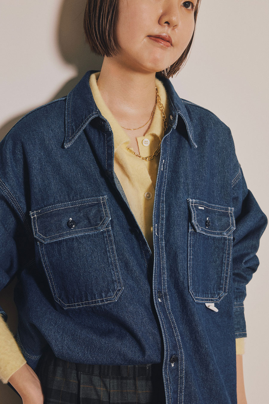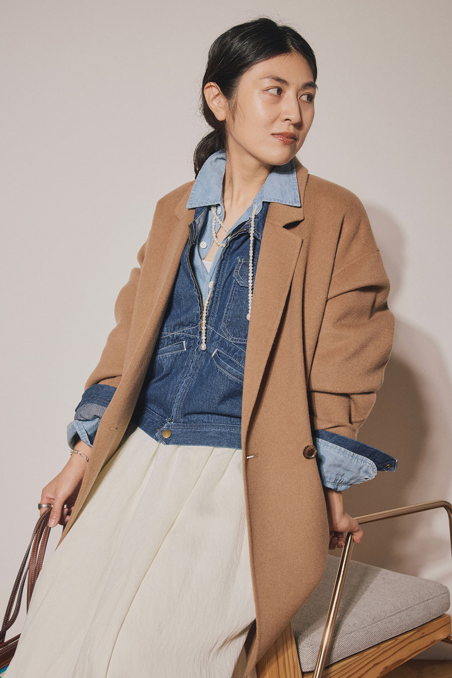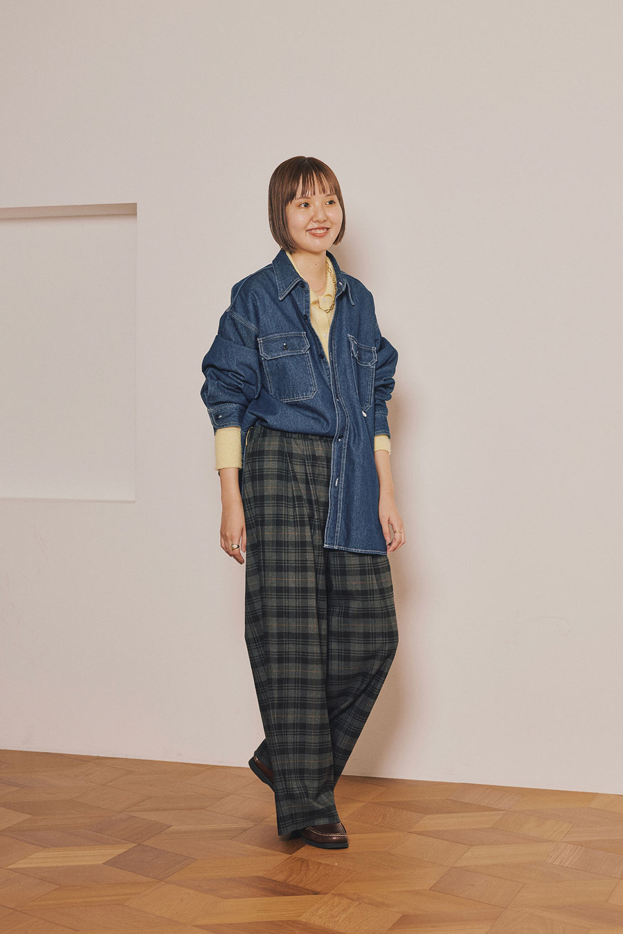 定番のダンガリーシャツをあえて短めのデニムブルゾンで合わせることで、今の気分にアップデート。柔らかなスカートはレディにまとめられるキーアイテムに。