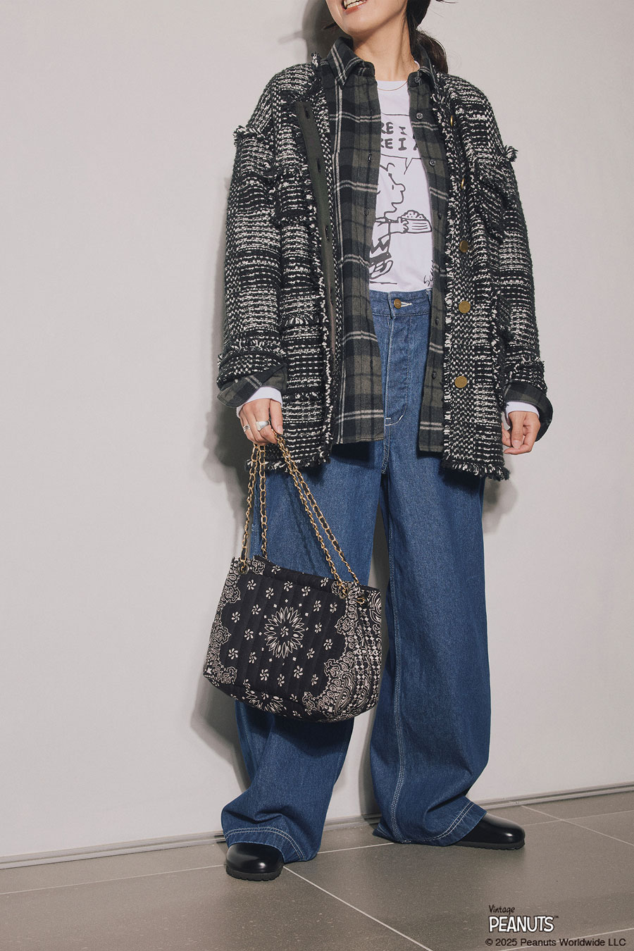 ロゴアイテムやチェックシャツ、バンダナ柄を合わせて柄ON柄にすることで、フレームワークらしさの際立つスタイリングの完成。
