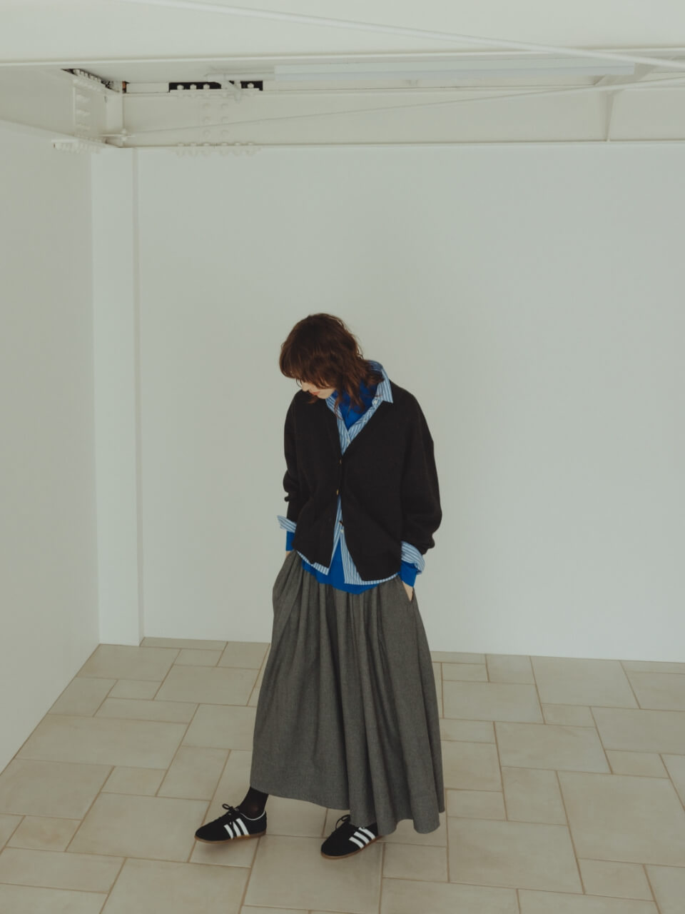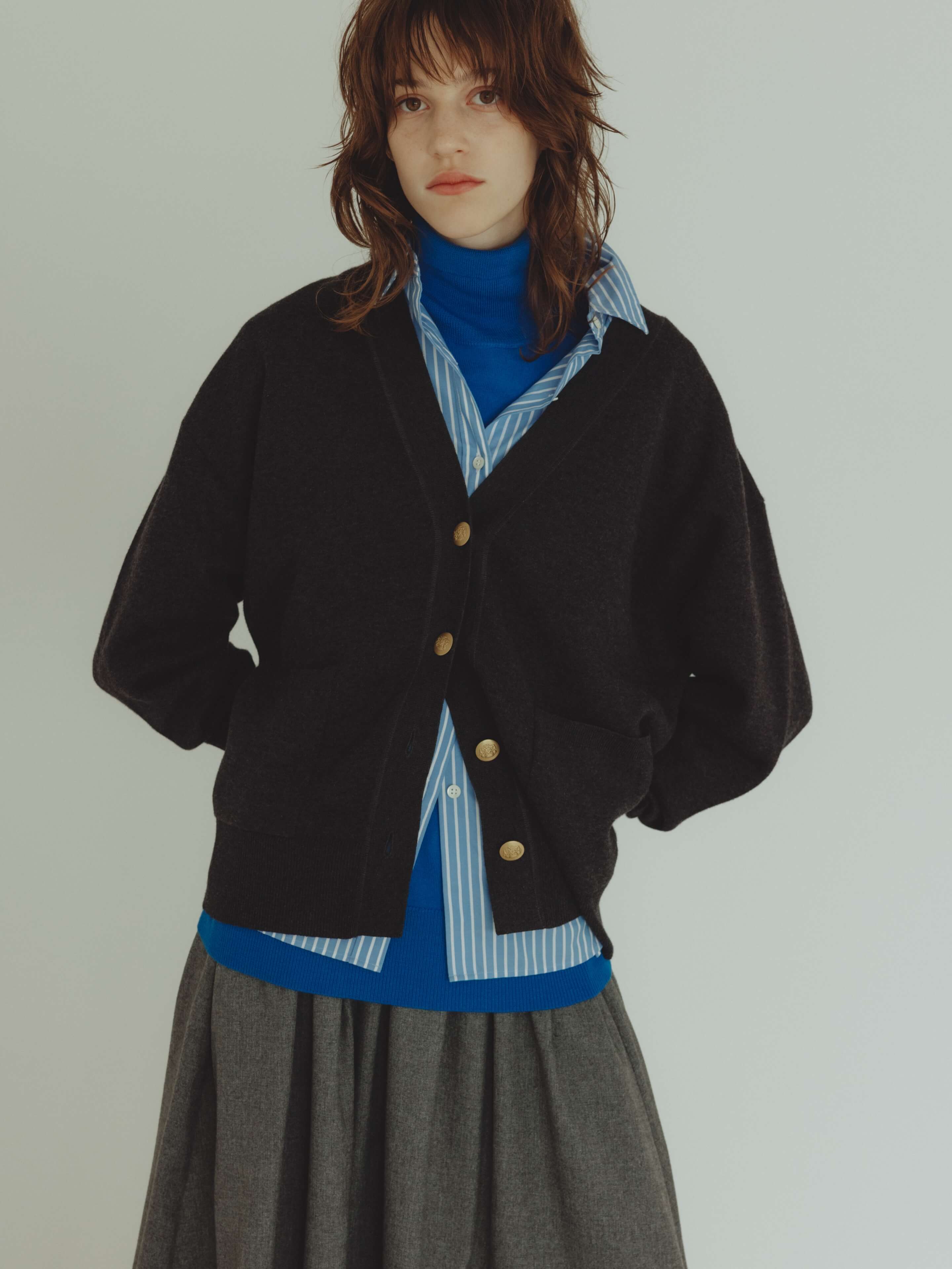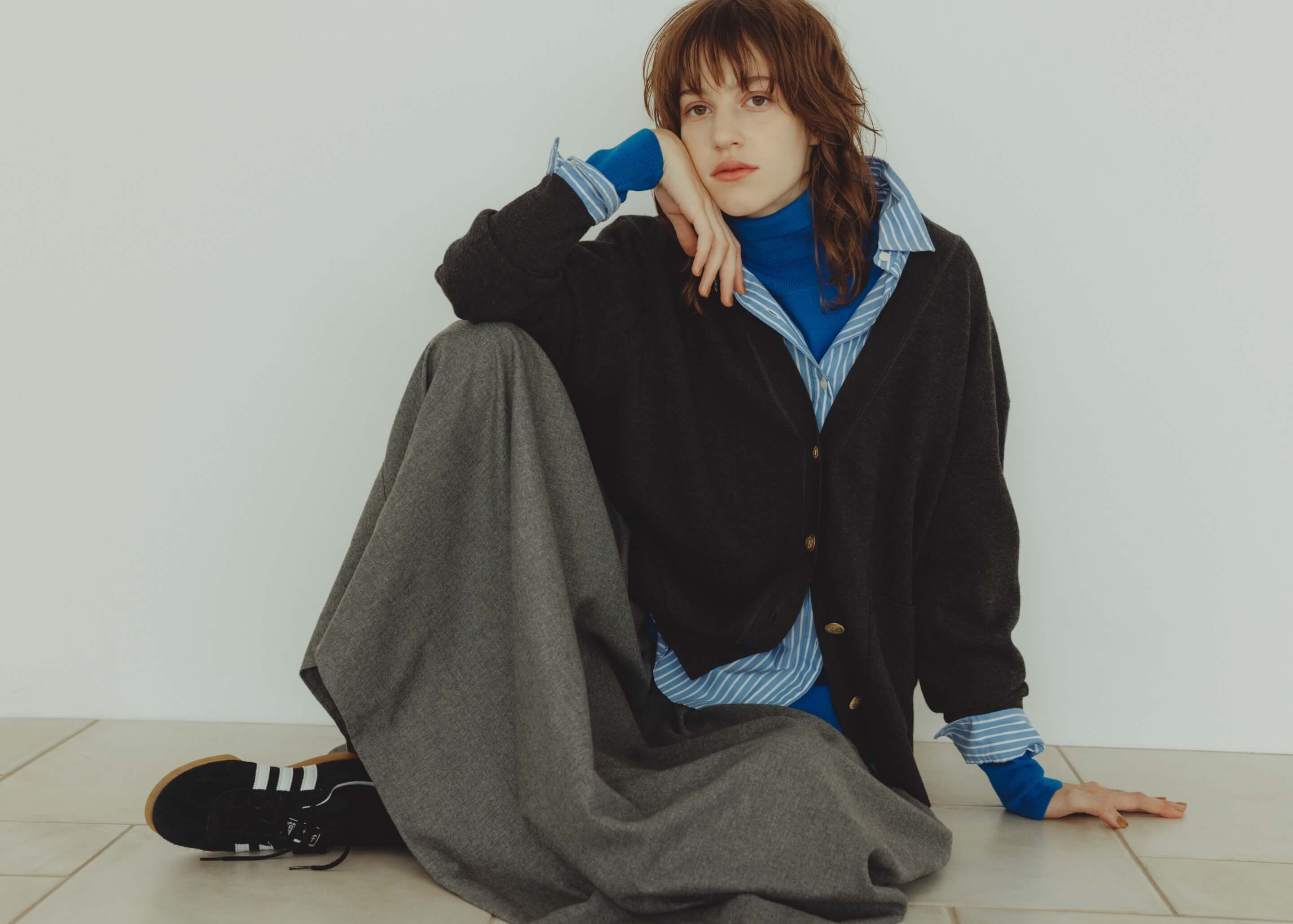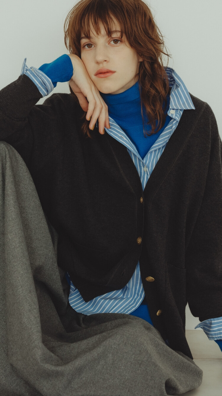 ゆったりしたサイズ感のカーディガンはゴールドのボタンがエレガントで大人なムード。鮮やかなタートルネックニット、間にはポイントになるストライプシャツ、最後はブルーと相性のいいグレーのニットカーディガンといったレイヤードで奥行きを演出。ボリュームあるスカートでリラックスした大人の女性を演出。