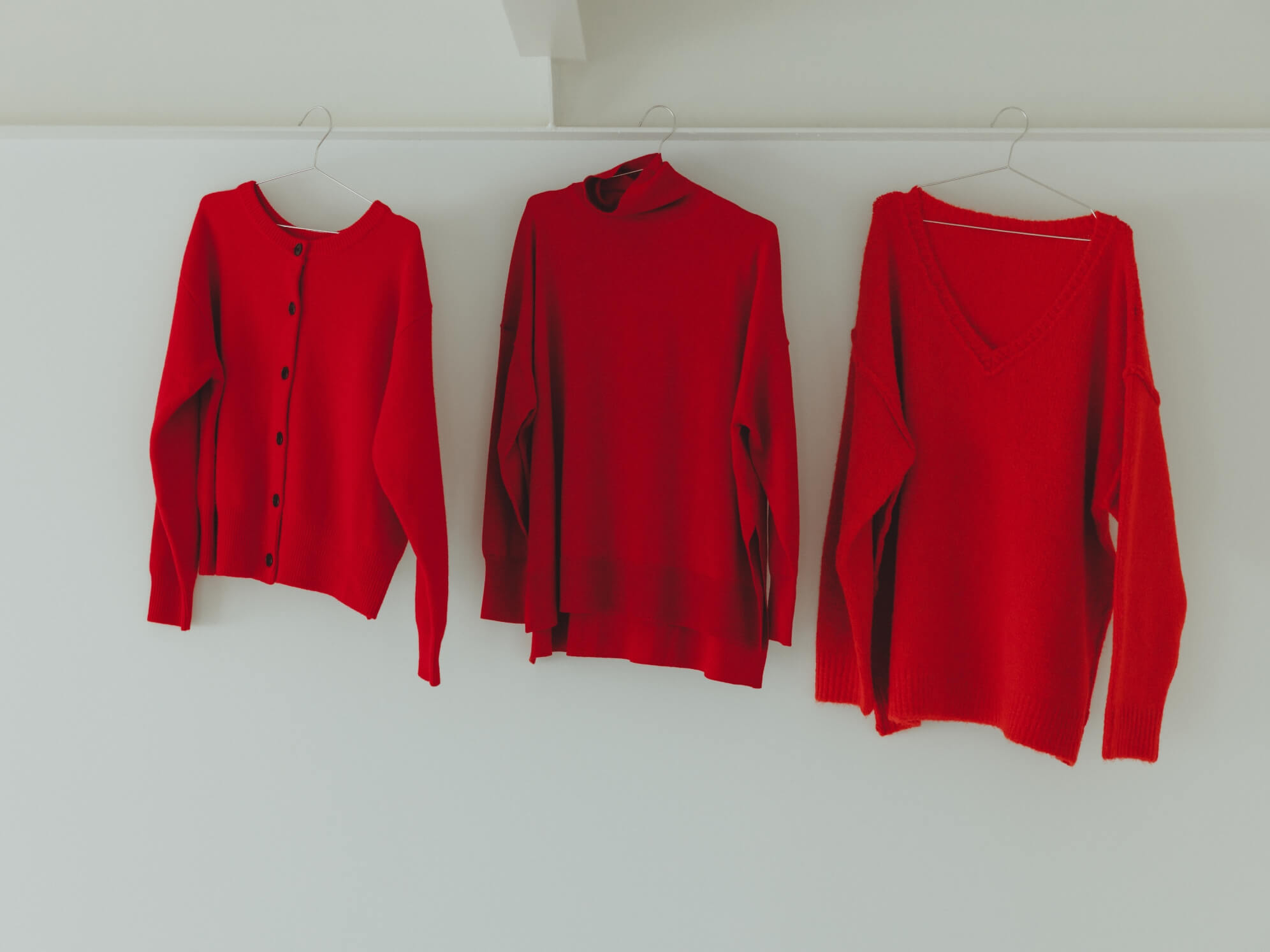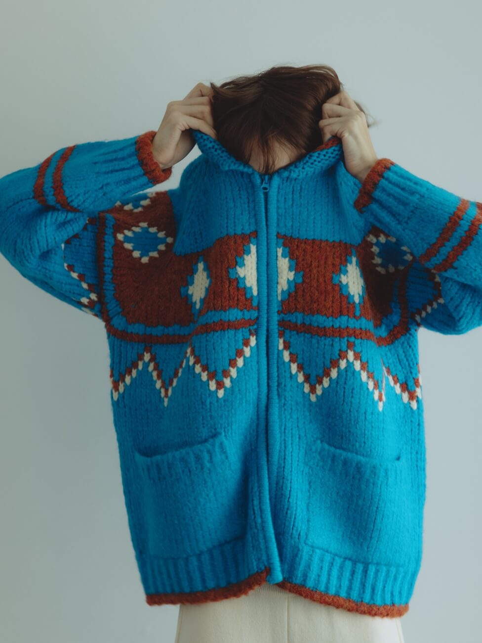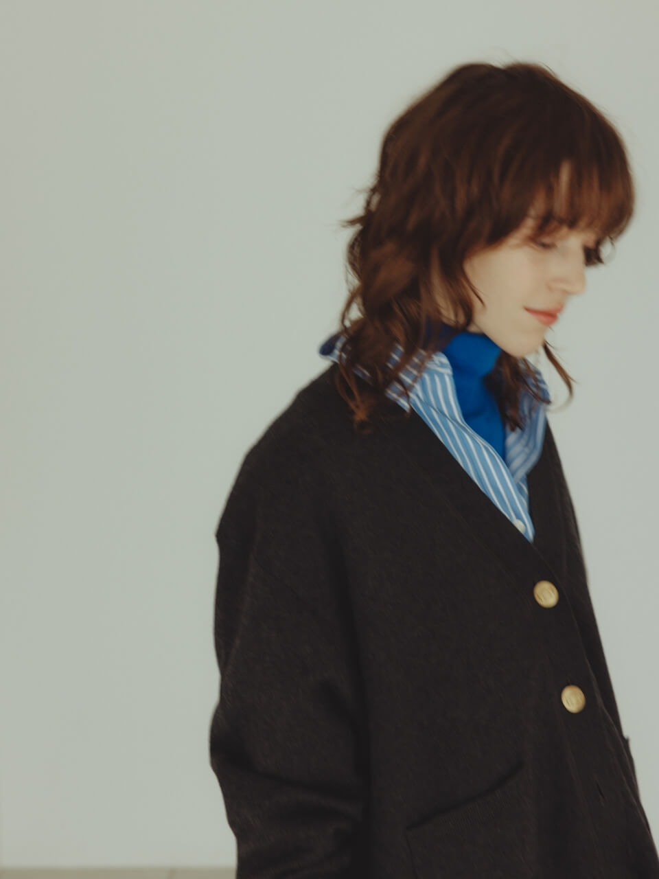 ゆったりしたサイズ感のカーディガンはゴールドのボタンがエレガントで大人なムード。鮮やかなタートルネックニット、間にはポイントになるストライプシャツ、最後はブルーと相性のいいグレーのニットカーディガンといったレイヤードで奥行きを演出。ボリュームあるスカートでリラックスした大人の女性を演出。