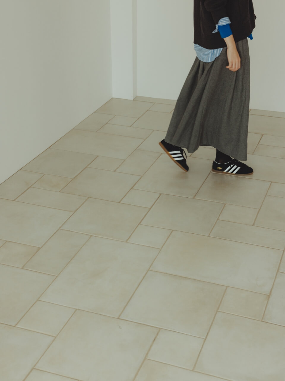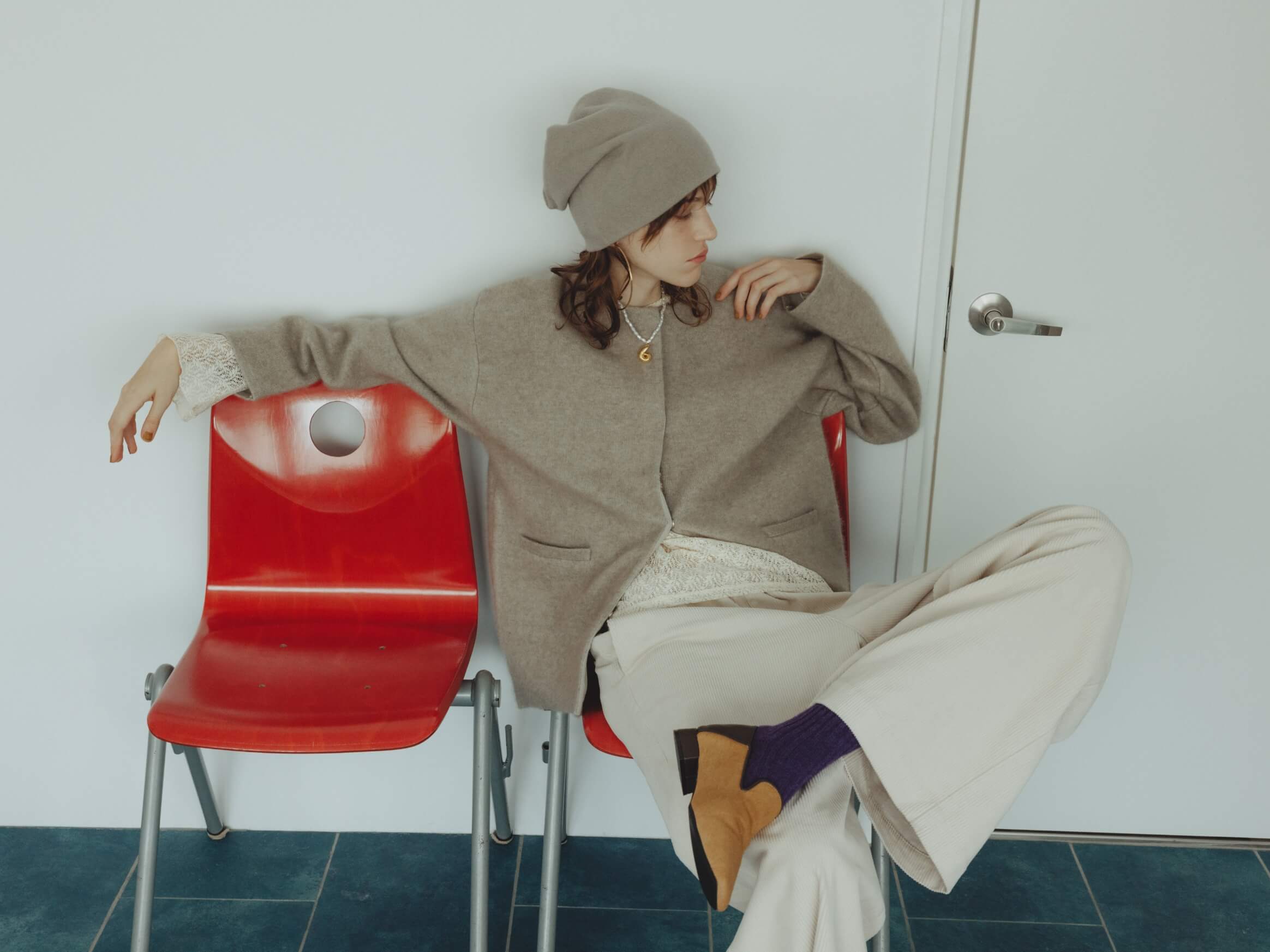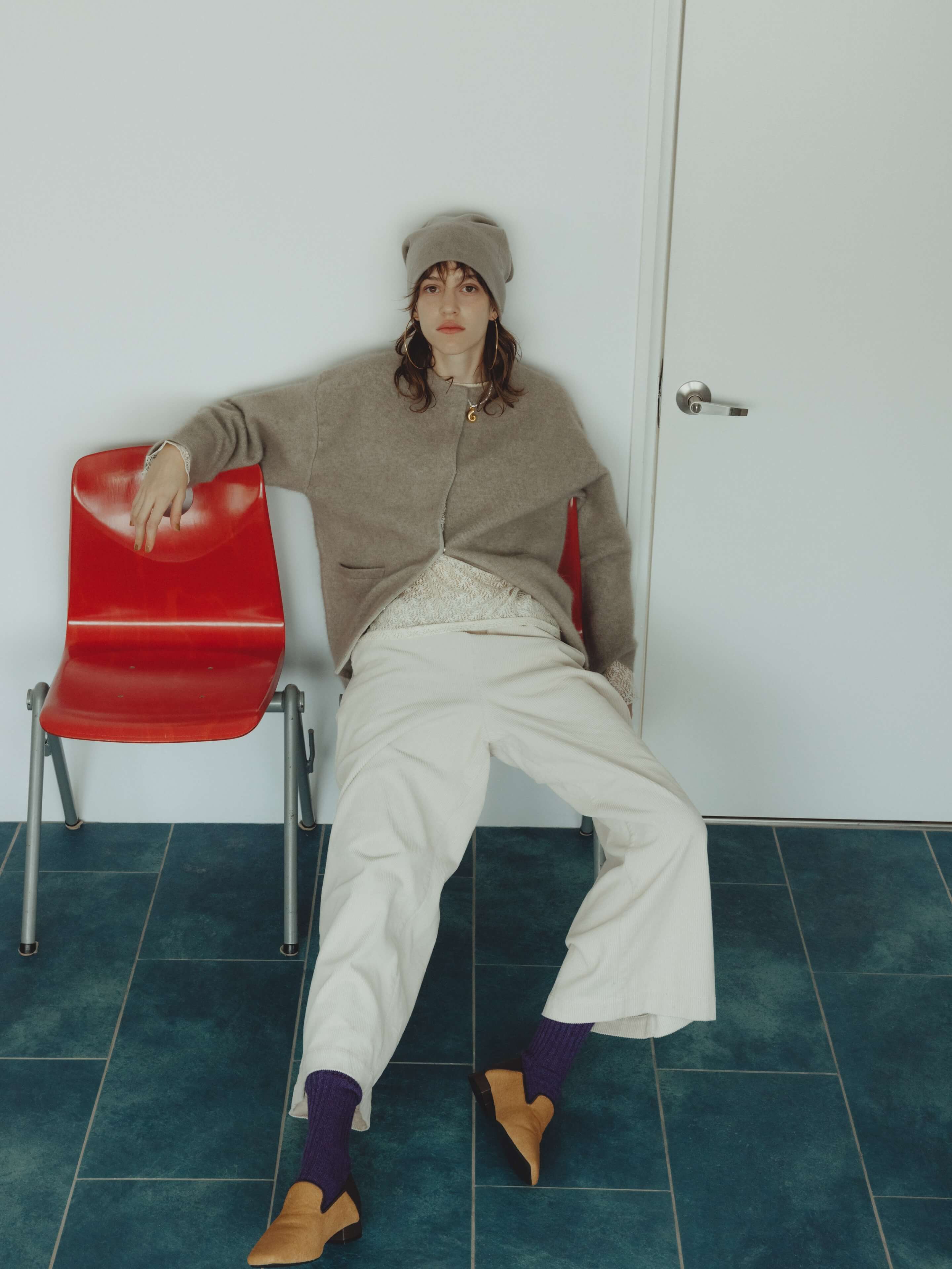 スタイリスト岩田さんも注目しているカーディガン以上、アウター未満の羽織り。ヒップにかかる絶妙な丈感が体型カバーにもなり、ボトムスを選ばずコーディネートできる。まろやかなベージュトーンの足もとにパープルでパンチを効かせ遊び心を。