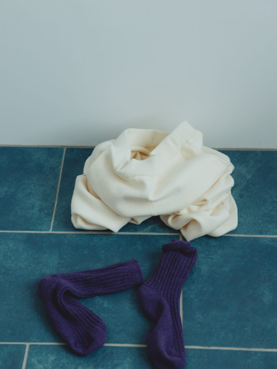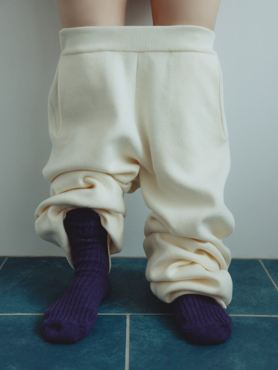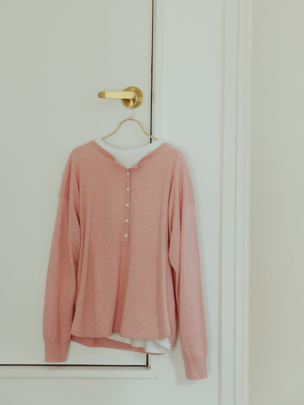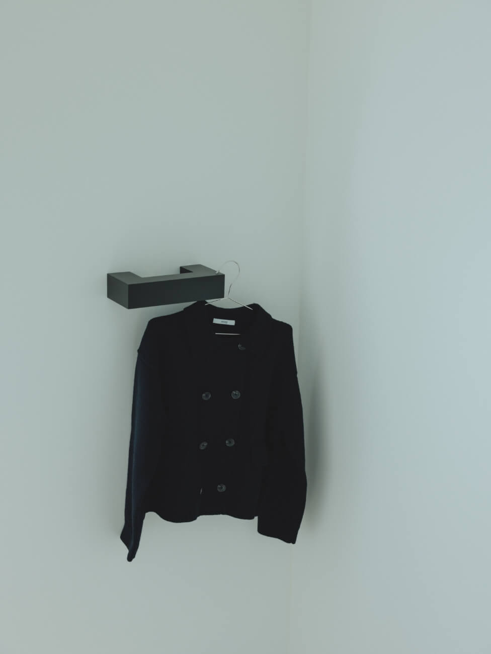 スタイリスト岩田さんも注目しているカーディガン以上、アウター未満の羽織り。ヒップにかかる絶妙な丈感が体型カバーにもなり、ボトムスを選ばずコーディネートできる。まろやかなベージュトーンの足もとにパープルでパンチを効かせ遊び心を。