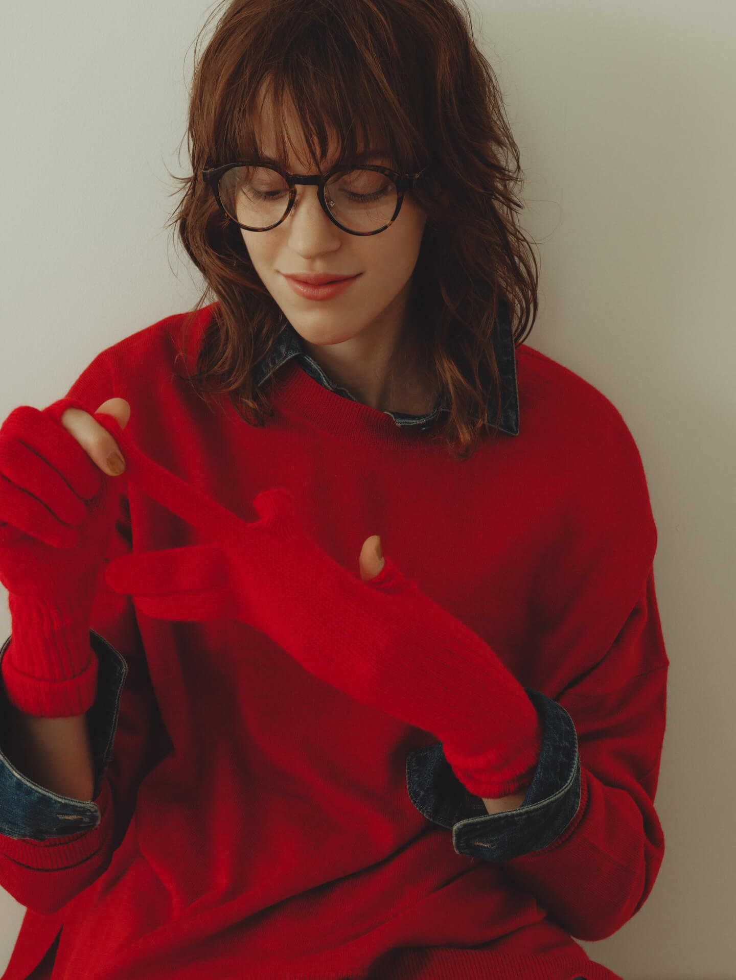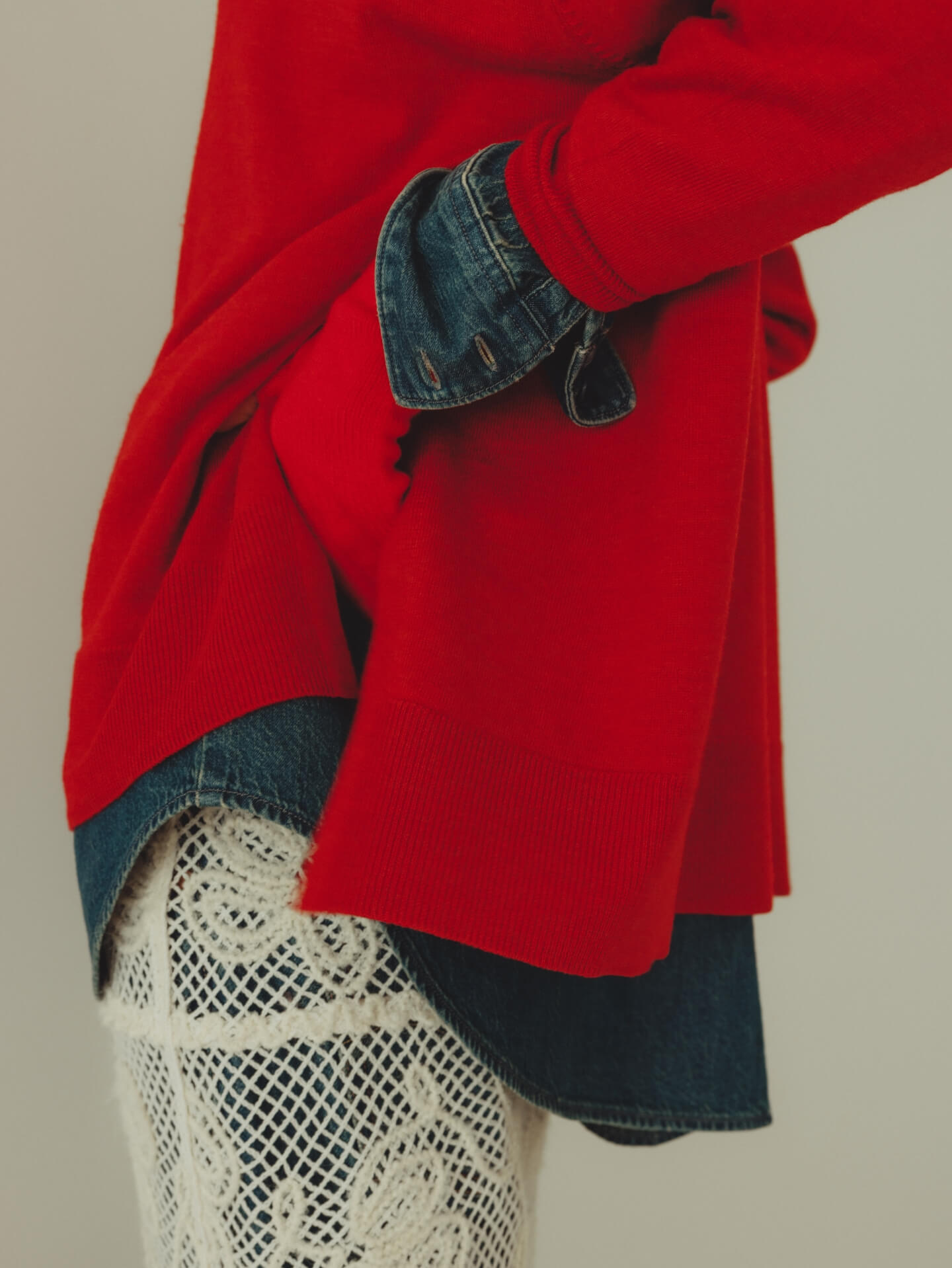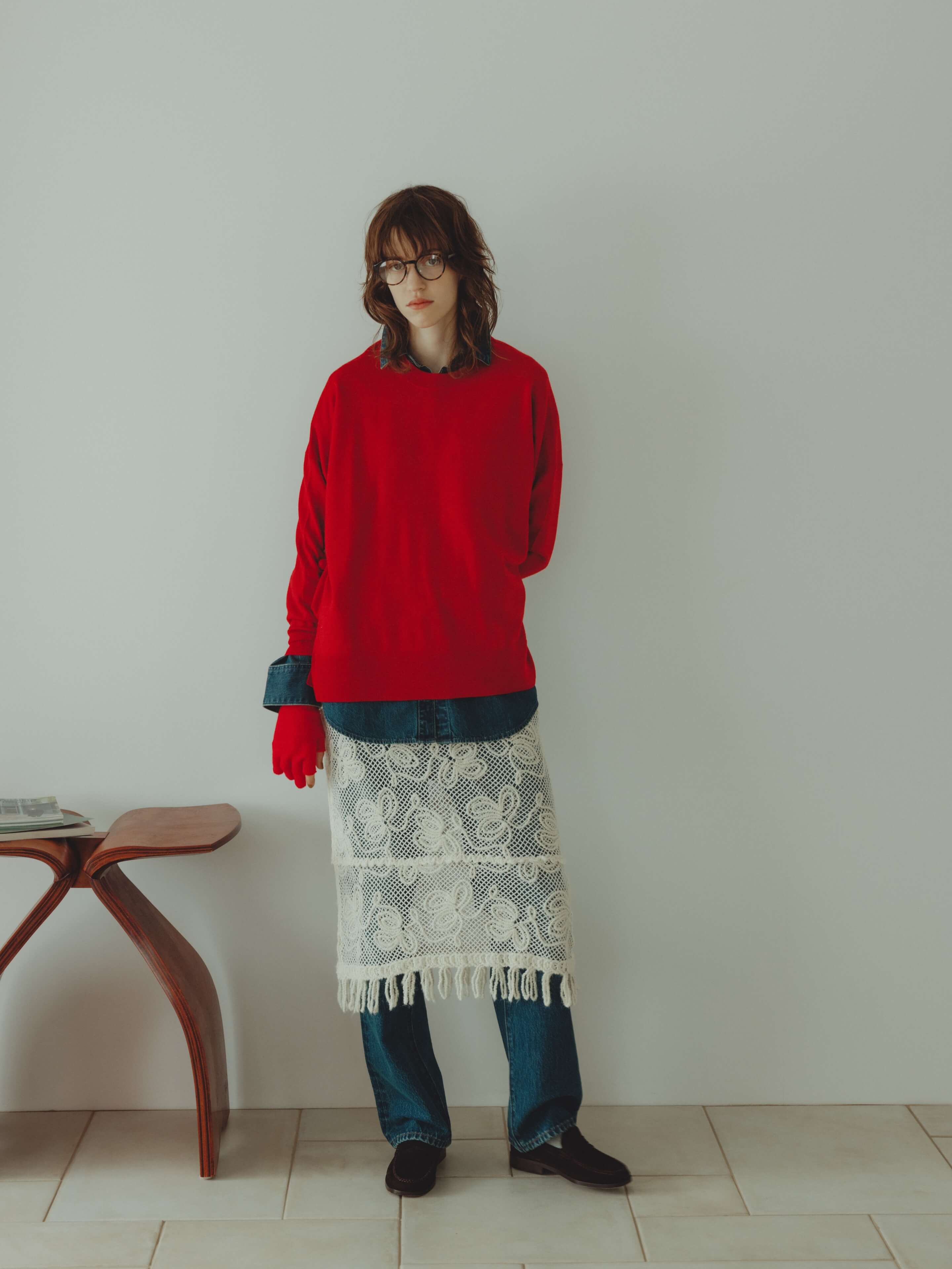 ウール100%ながら滑らかな肌触りとワイドシルエットが人気のクルーネックニット。サイドスリットが入っているためデニムシャツとのレイヤードもごわつかなく程よい抜け感が生まれる。クロシェ編みスカートを取り入れることでかわいさと強さが交差する装いに。