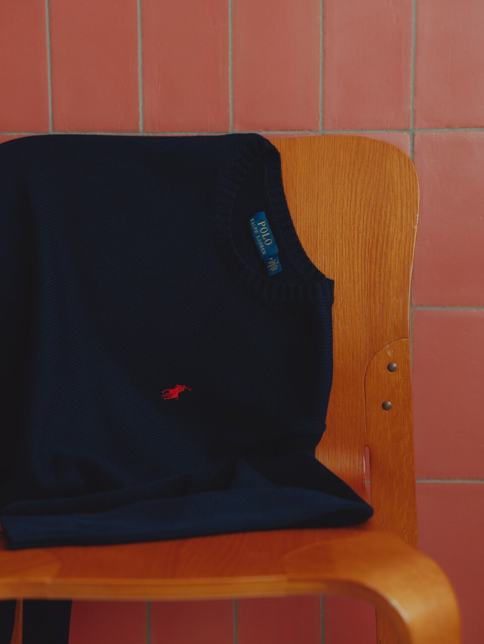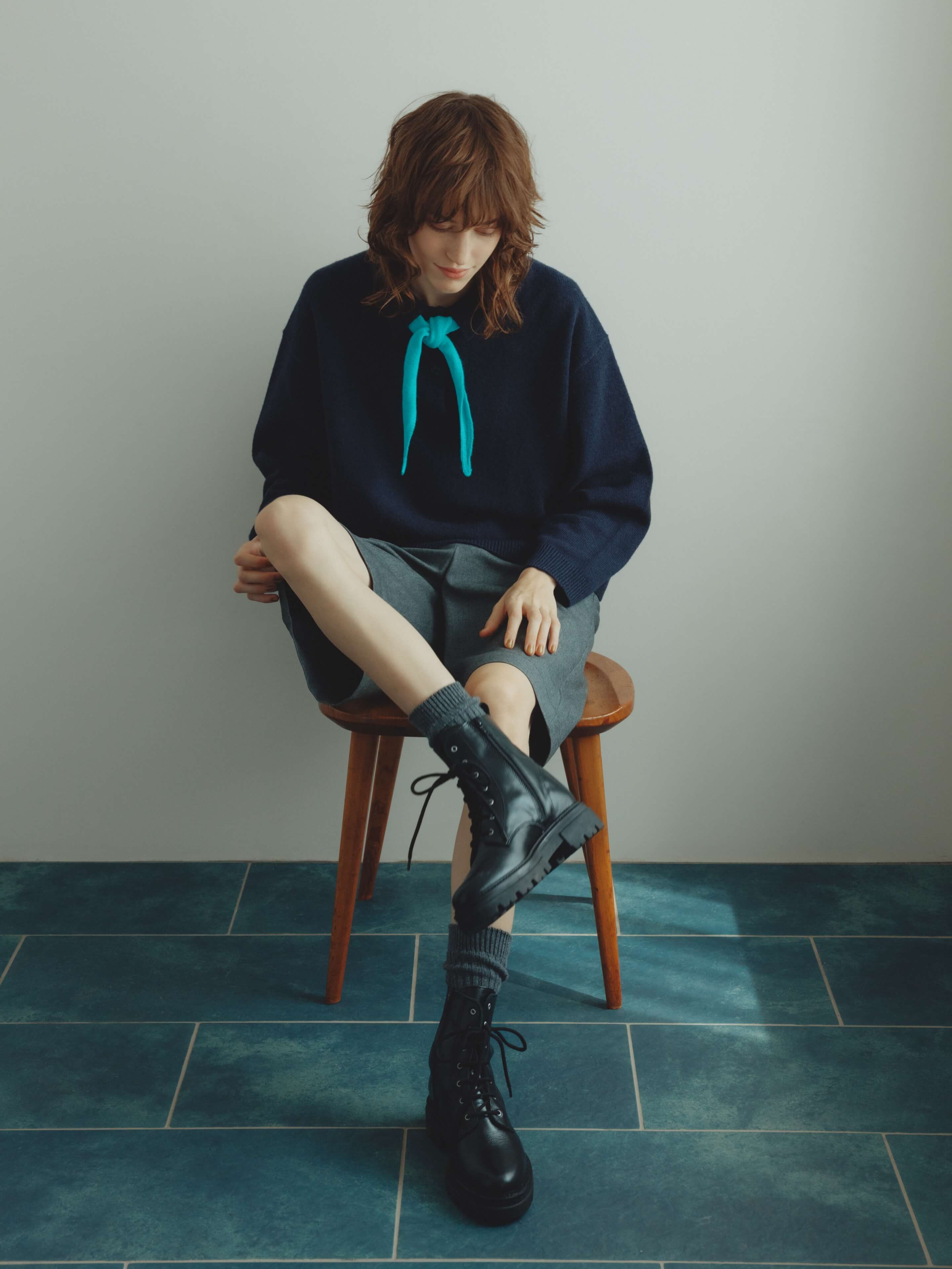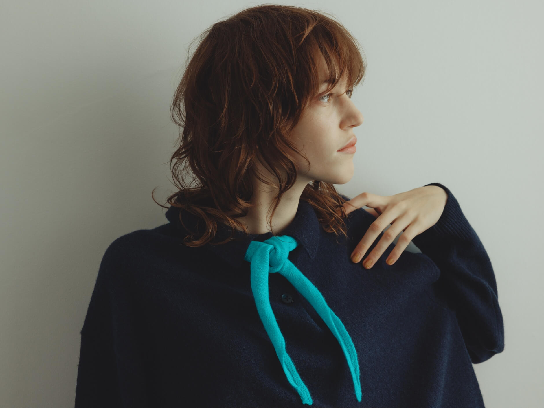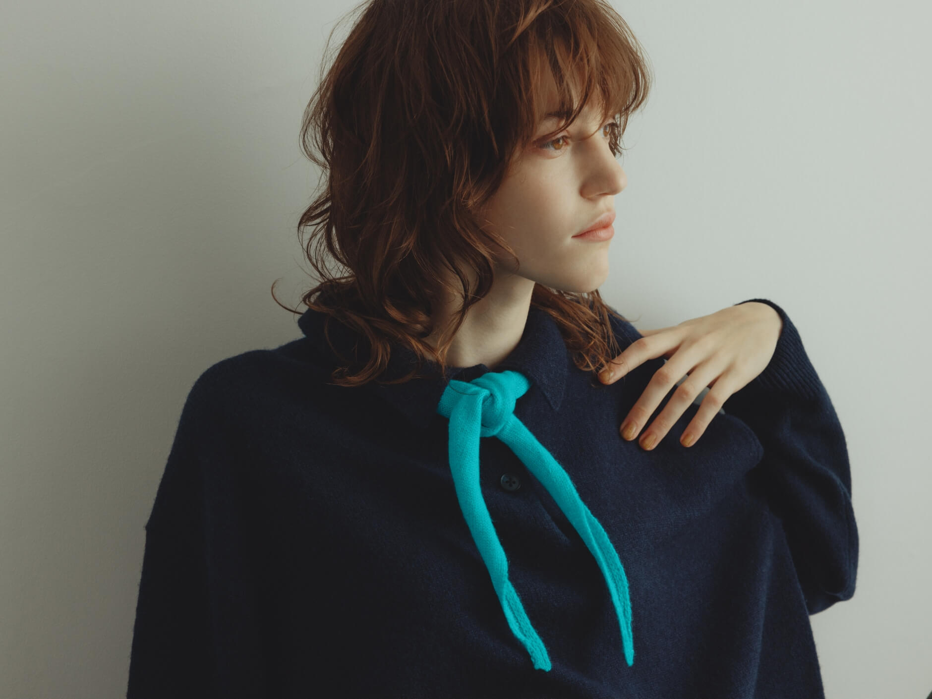感度が高い人が注目するポロタイプは夏に続き、秋も注目。ラムウール混が軽くて暖かく、シャツ襟とボタンがときにはきれいめに、ときにはカジュアルにと色々なシーンで対応する万能デザイン。ボーイッシュな装いを盛り上げるキャッチーなブルーのスカーフがポイント!