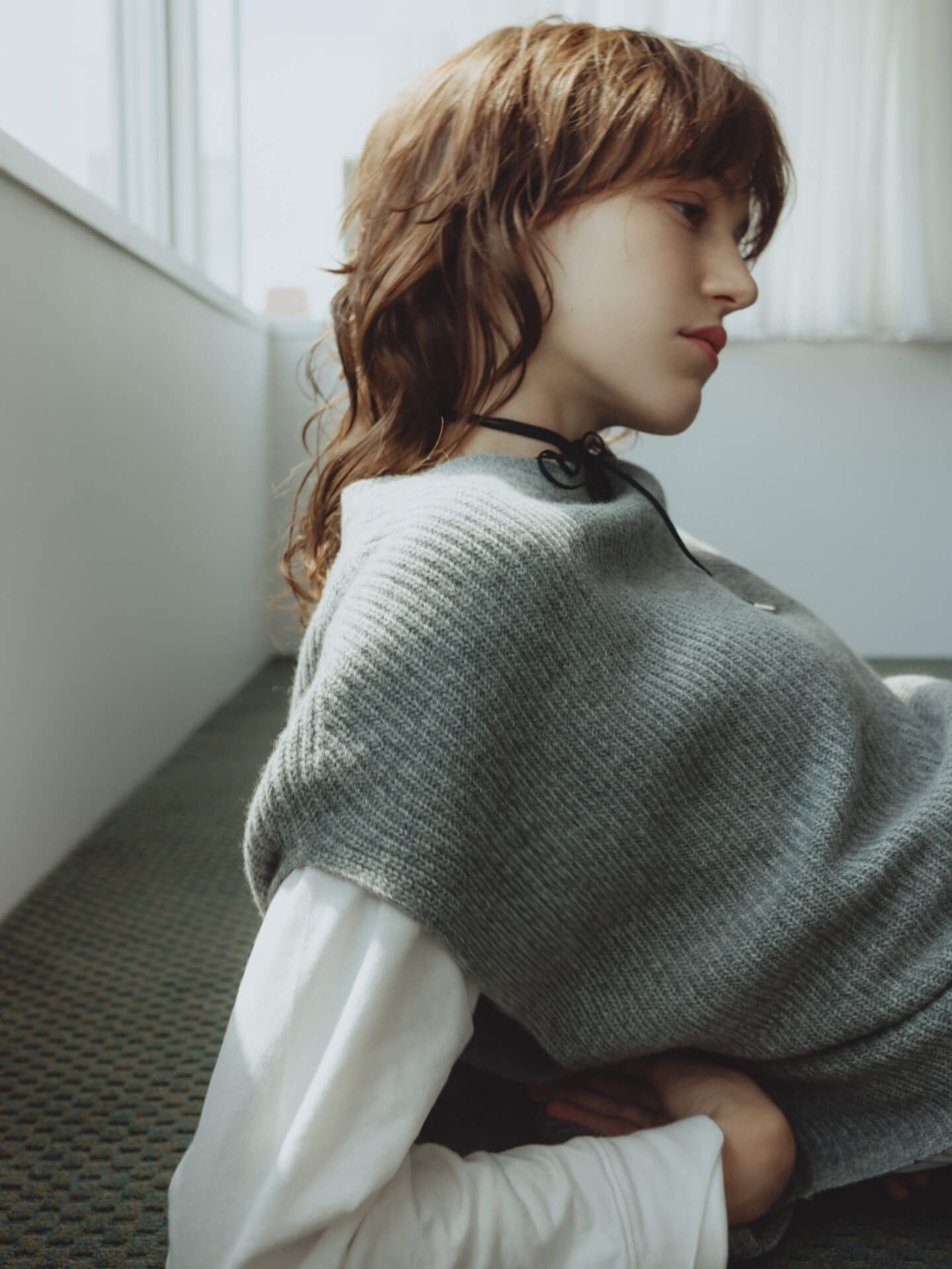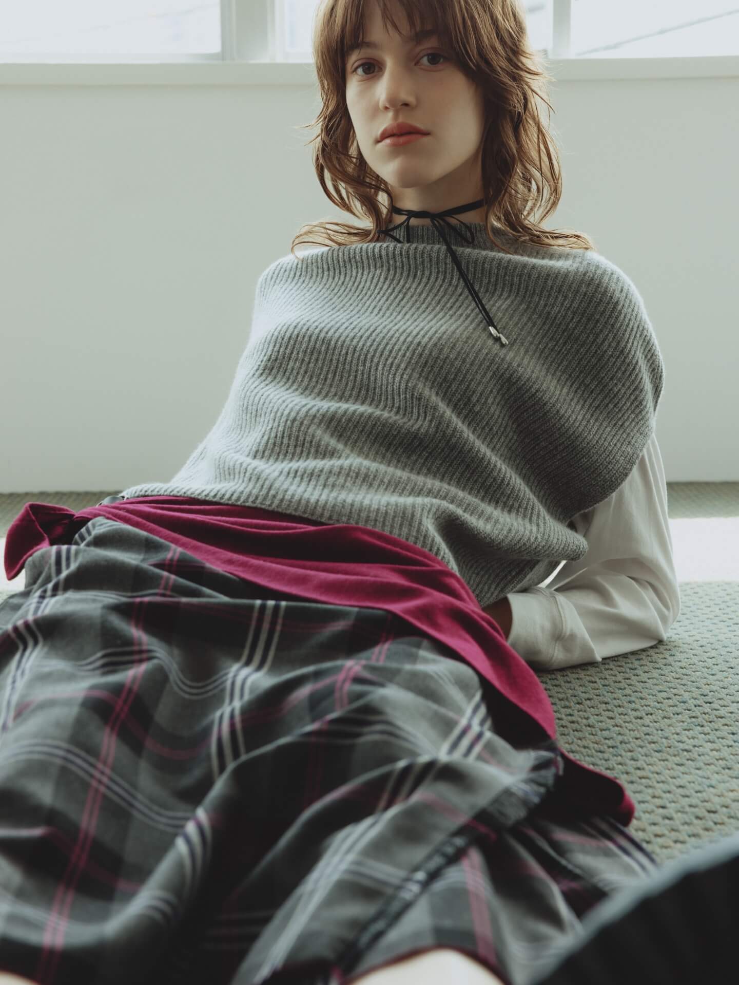 ゆったりしたサイジングかつ肩がおちるようなデザインが取り入れやすいベスト。カットソーやシャツはもちろん、ワンピースとのバランスもよく、長いシーズン使える。同じトーンのチェックスカートにあわせ、腰に巻いたパープルのスカーフでコーディネートに抑揚を。