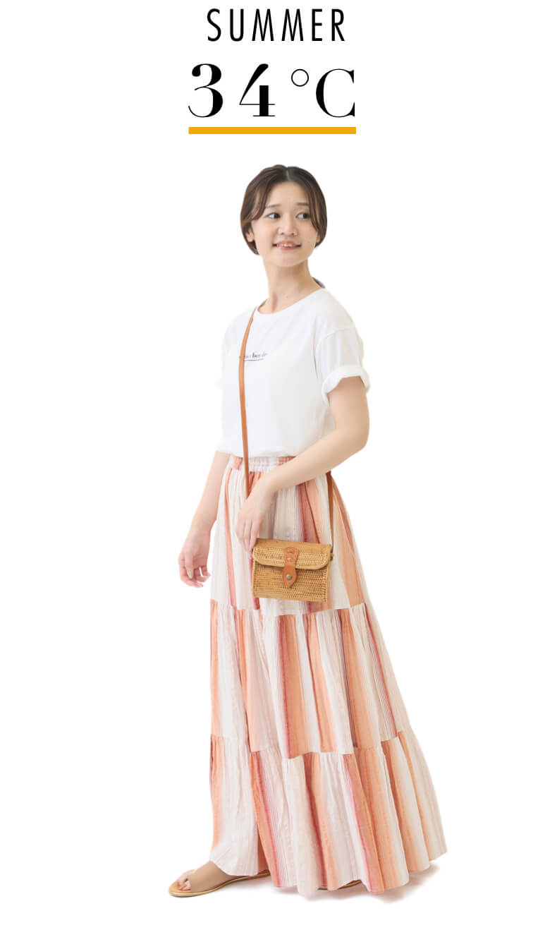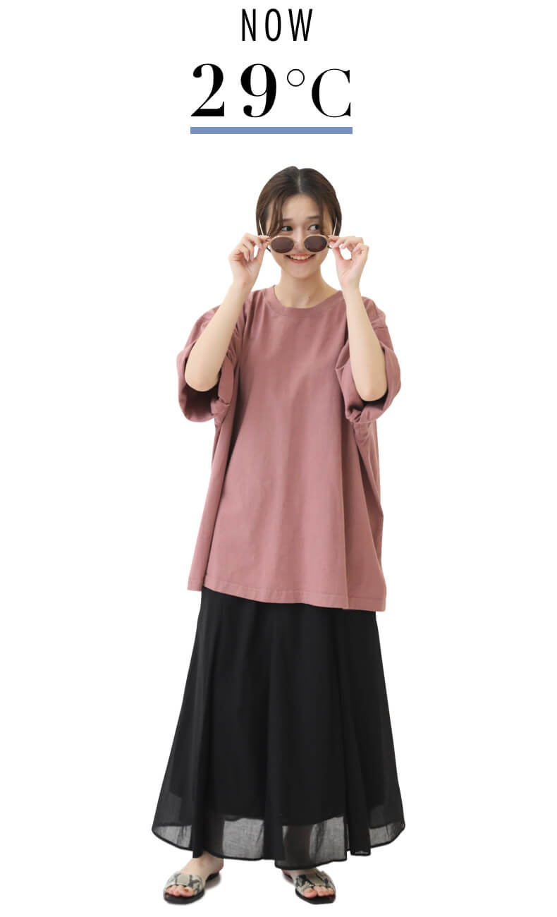 - TEEシャツ×スカートのワンツーコーデは思い切ったカラーコーデにチャレンジ。スカートの主役感をさりげなく引き立てる名わき役に。