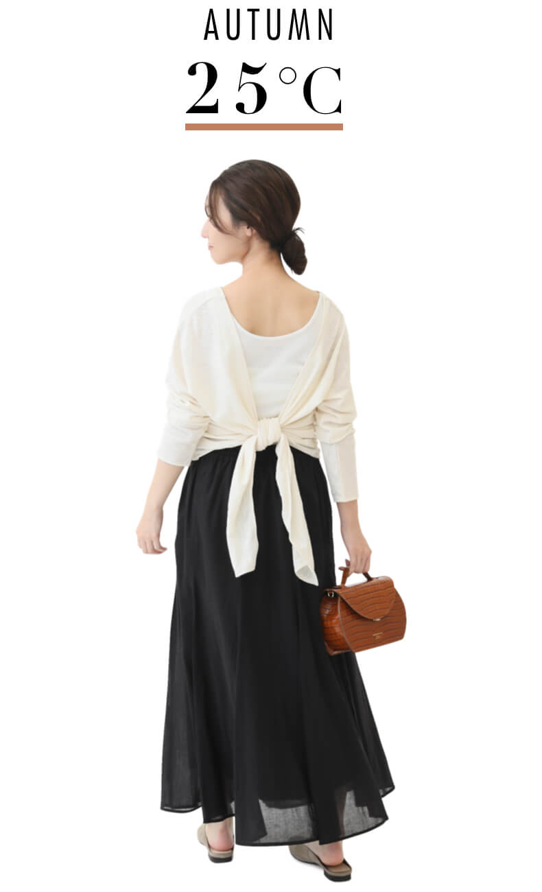- まだ羽織りがいらないこの気温はバックコンシャスなトップスを合わせて。バッグはレザーの型押しにして小物で季節感を取り入れる。