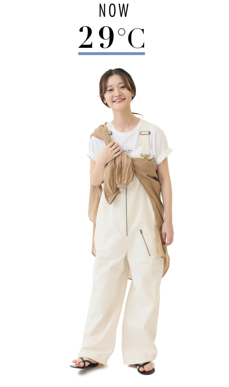 - サロペット合わせで思い切りカジュアルにまとめつつオールホワイトが清涼感を演出。肩巻きしたシャツはスタイリングのポイントになるのはもちろん、肌寒い夜の心強い味方。