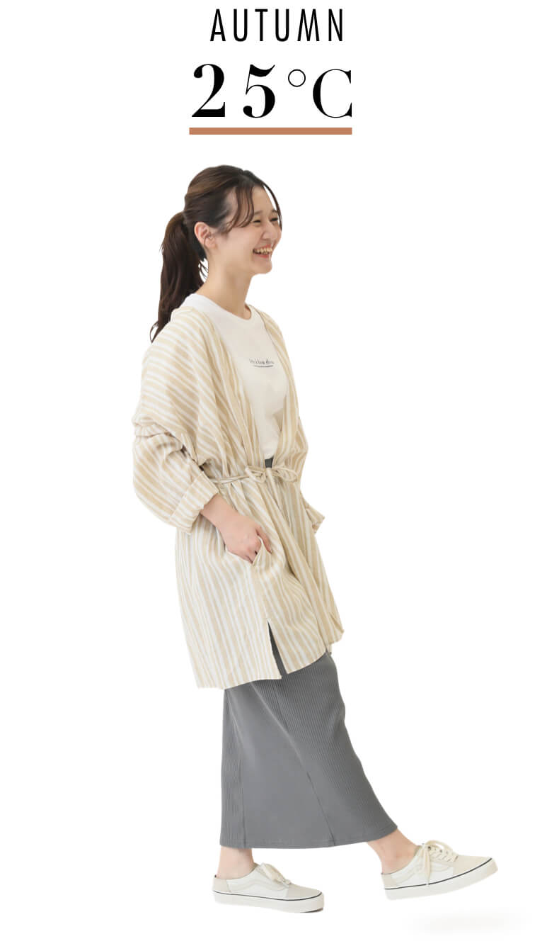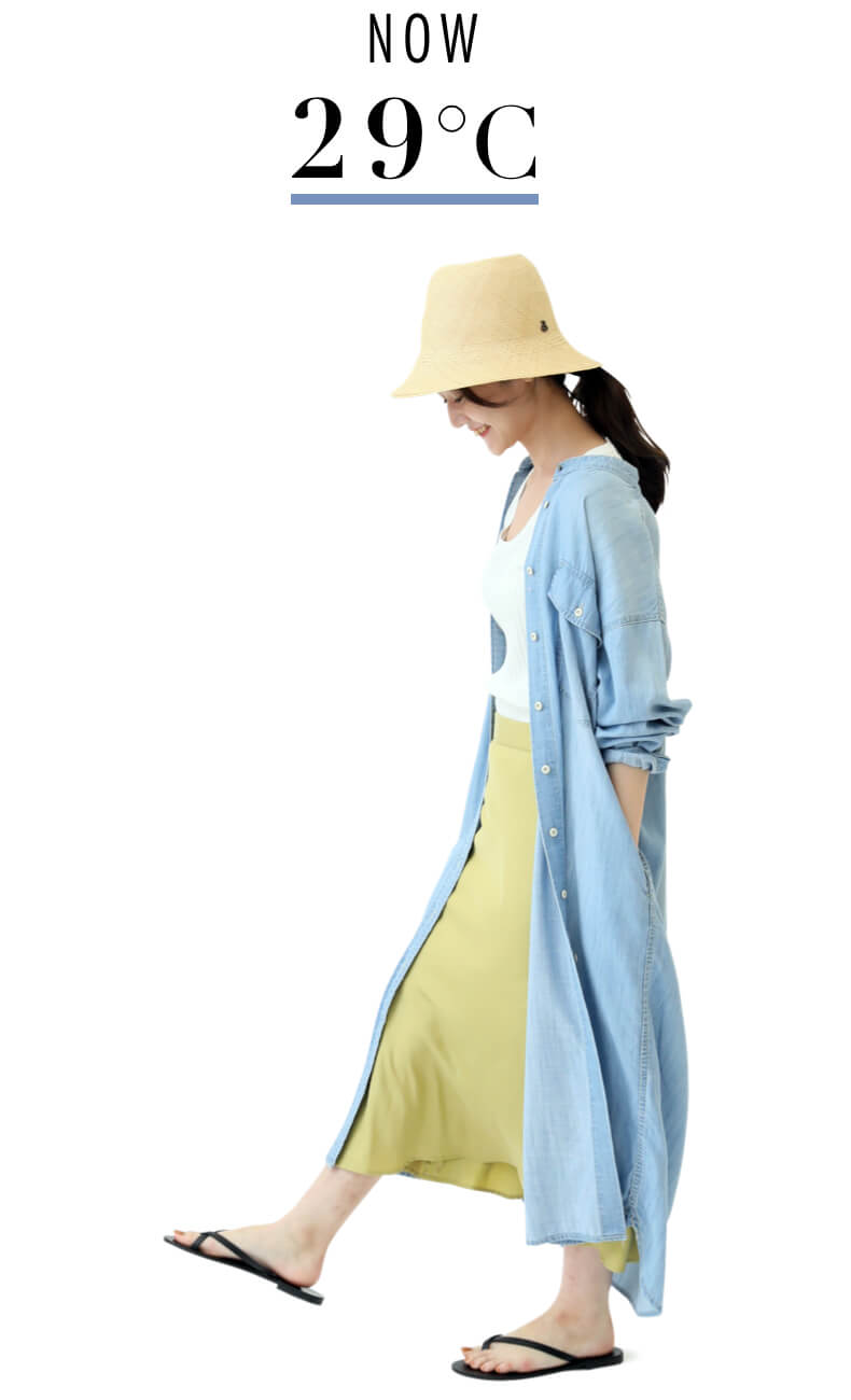 - ノースリーブの一枚着で出かけるには勇気がいる。そんな気温の日には羽織りとして活躍。シャツではなくシャツワンピを選ぶことで羽織る前と全く違う雰囲気を楽しんで。