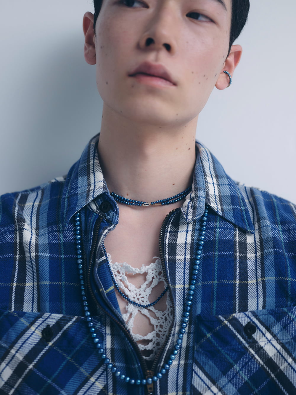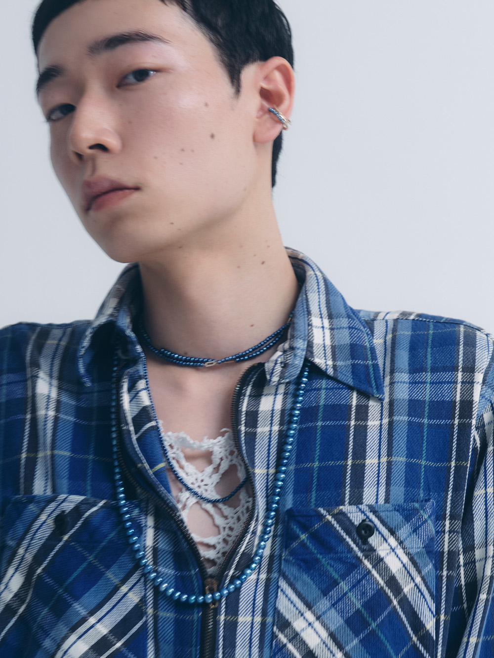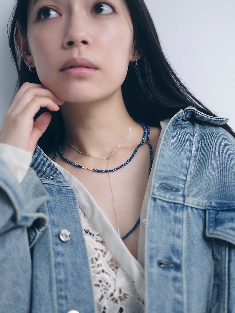デニムを中心にコーディネートを組んで、それに合うようにチェックのシャツと、白のインナーを選びました。アクセサリーの中でネックレスが1番好きで、このインディゴは新鮮でキラキラしてすごく可愛い。