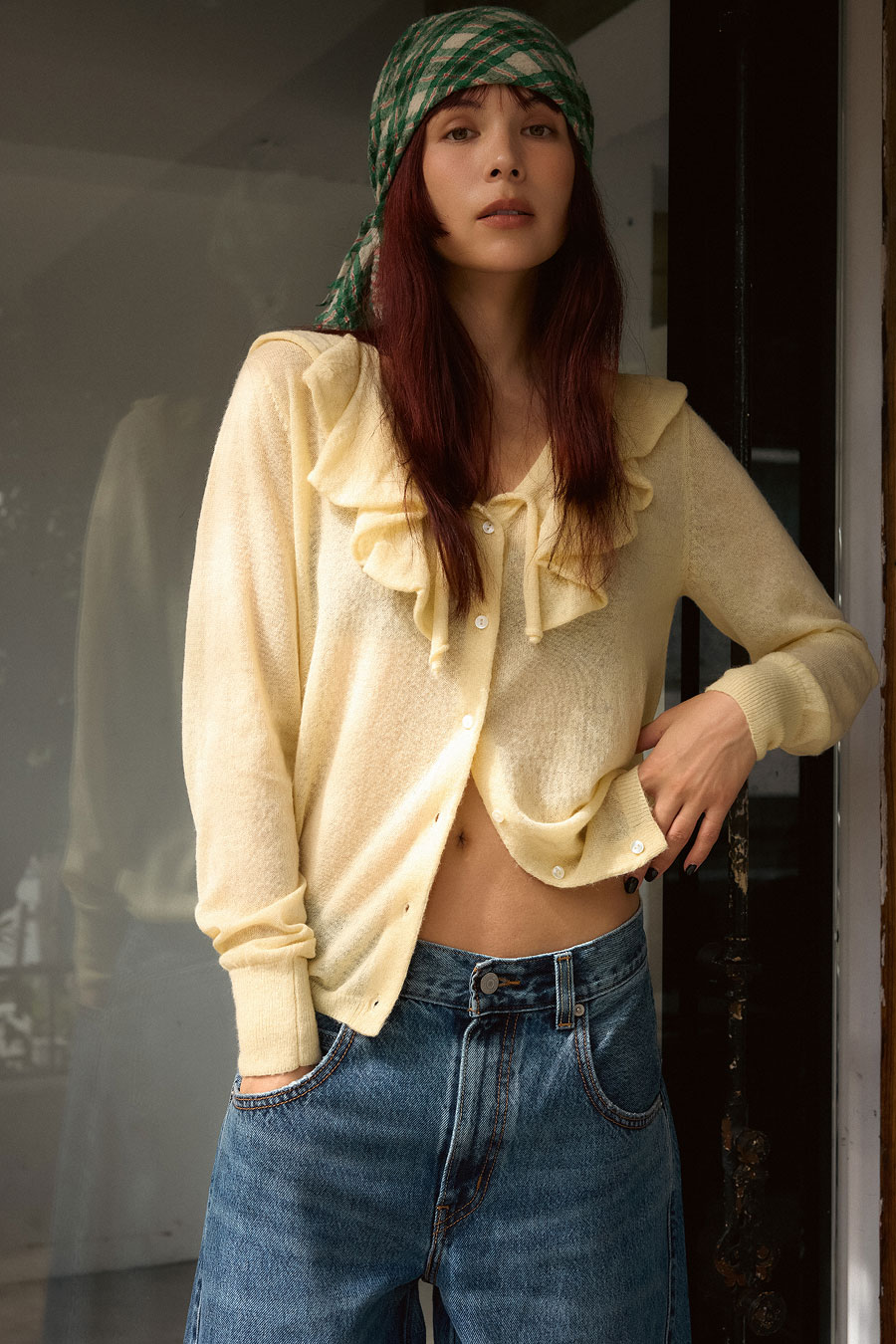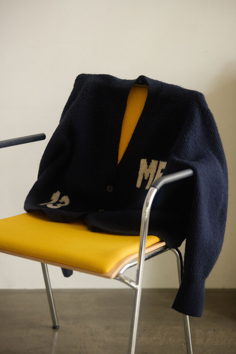 毎年好評のスーパー140シリーズが今年もアップデートして登場。手触りが柔らかく上品な光沢感がスーパー140ウール100%の魅力でクールなステンカラーコートとマッチ。中に着たフリルがポイントのニットカーディガンはボタンをしめてトップスとして着用。きれいなイエローがコートの下でもとびきりの存在感。
