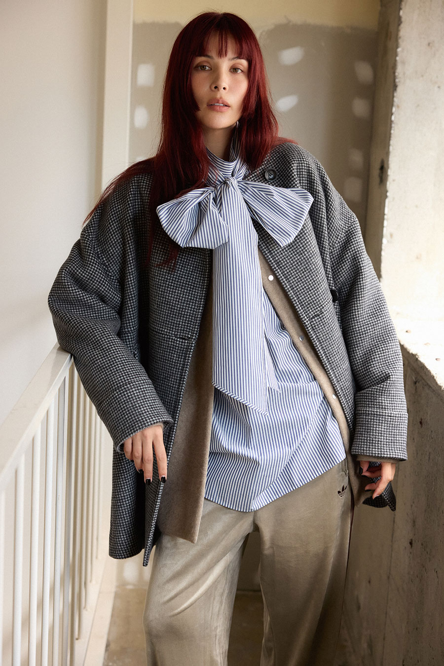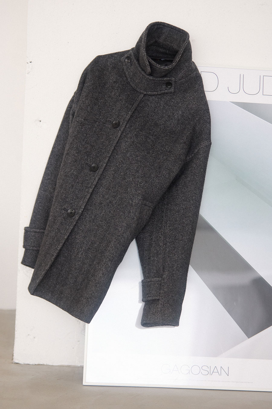 ヘリンボーンのクールな表情とスタンドカラーがマッチしたミドル丈。洗練したスタイルに。