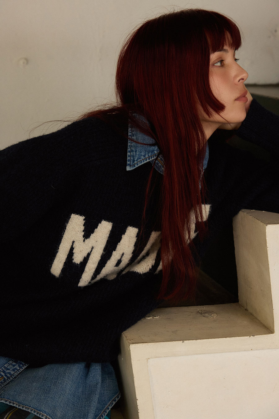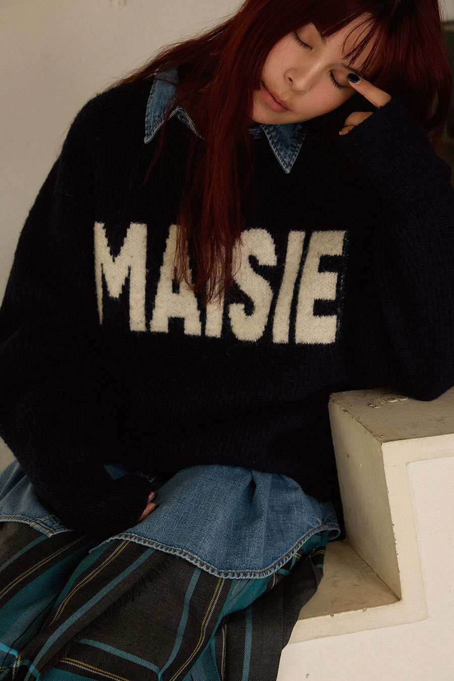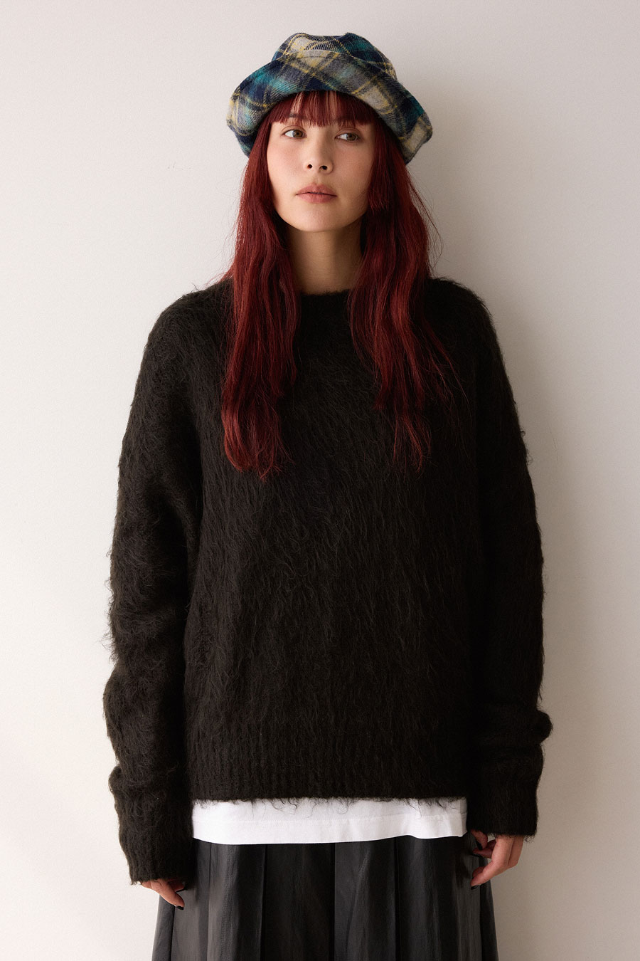 一見シンプルに見えるミドル丈コートも大きな襟や丸みを帯びたシルエットがキャッチー。厚手のインナーも袖を通す余裕があり、ハリ感があるためきれいなシルエットを生み出す。手編みのような凸凹感がたまらないニットは大きめのロゴで着映え間違いなし。
