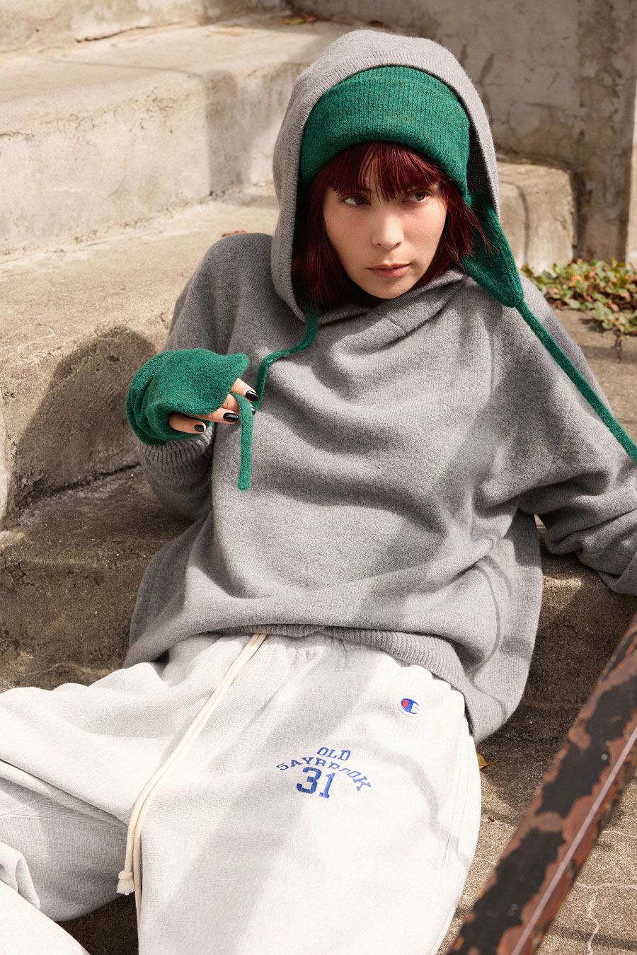 ラフなフードニットに相反する