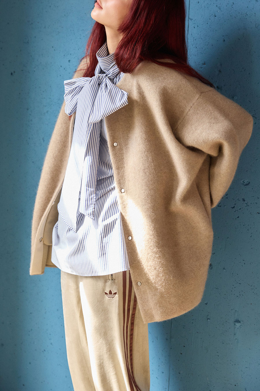いまの季節に活躍するアウター未満のカーディガン。コクーンシルエットや隠しドットボタンなので見た目がすっきり。上に羽織ったスーパー140シリーズのショートコートも見た目以上に暖かい、高コスパな優秀デザイン。首もとのコーディネートが楽しいクルーネックはボウタイで作るビックリボンでコーデに抑揚をつけて。
