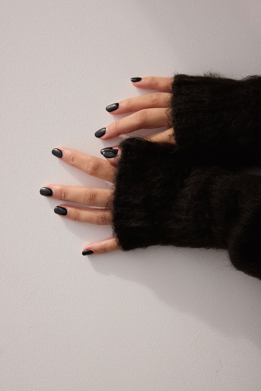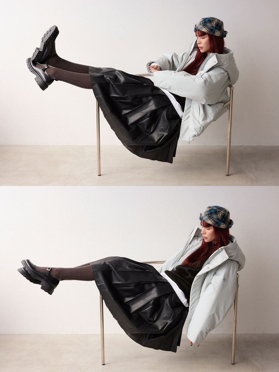 スポーツモードを提案する<デサント オルテライン>に別注したスペシャルなジャケット。女性が着ることを考慮したシルエットはもちろん、防寒性も問題なし。可愛い毛足の長さがポイントのシャギーニットやスカートを黒で統一し、モードによせたスタイルが街でも一段と映えるはず。