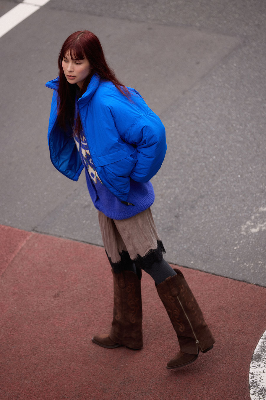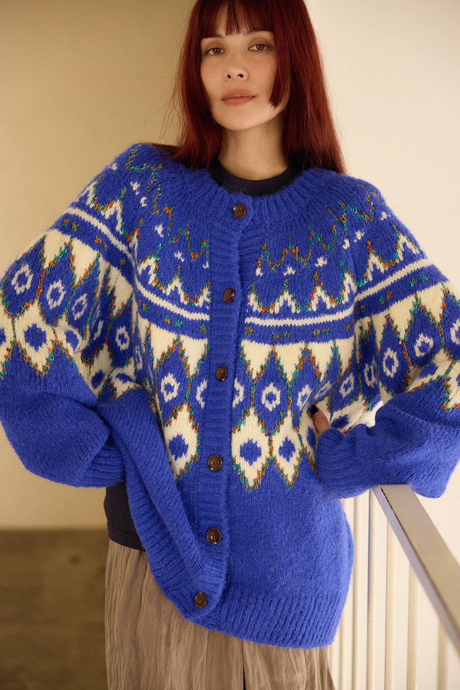 短めの丈に身幅たっぷりなバランスがなんともたまらない愛らしさのジャケットは、今季注目のワイドシルエットのパンツと相性抜群。インナーに着たノルディックカーディガンも袖のボリューム感や長めの着丈が今っぽいスタイルに馴染みつつなんだか懐かしさも感じられるデザイン。